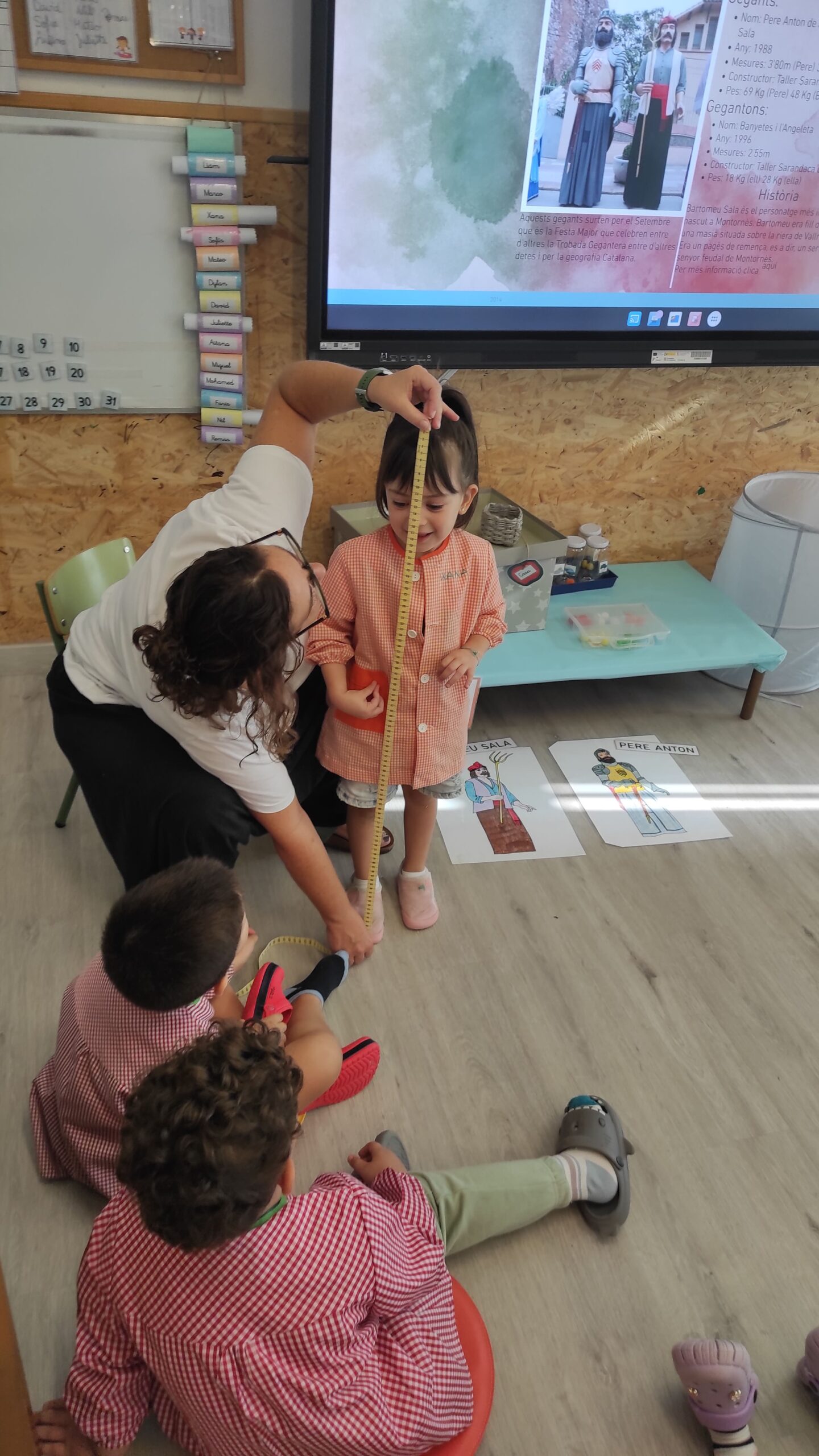 PER RESOLDRE AQUESTES PREGUNTES, VAM AVERIGUAR QUE ELS GEGANTS MESUREN 3’80 METRES! PERÒ AIXÒ ÉS MOLT ALT O MOLT BAIX? NOSALTRES SOM MÉS ALTS QUE UN GEGANT? QUANT MESUREM NOSALTRES? QUANT MESURA LA NOSTRA AULA, I LA PORTA?