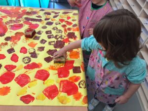AMB TOTS AQUESTS COLORS, HEM FET EL NOSTRE MURAL DE LA TARDOR AMB PINTURA, ESTAMPANT AMB DIFERENTS ESPONGES.