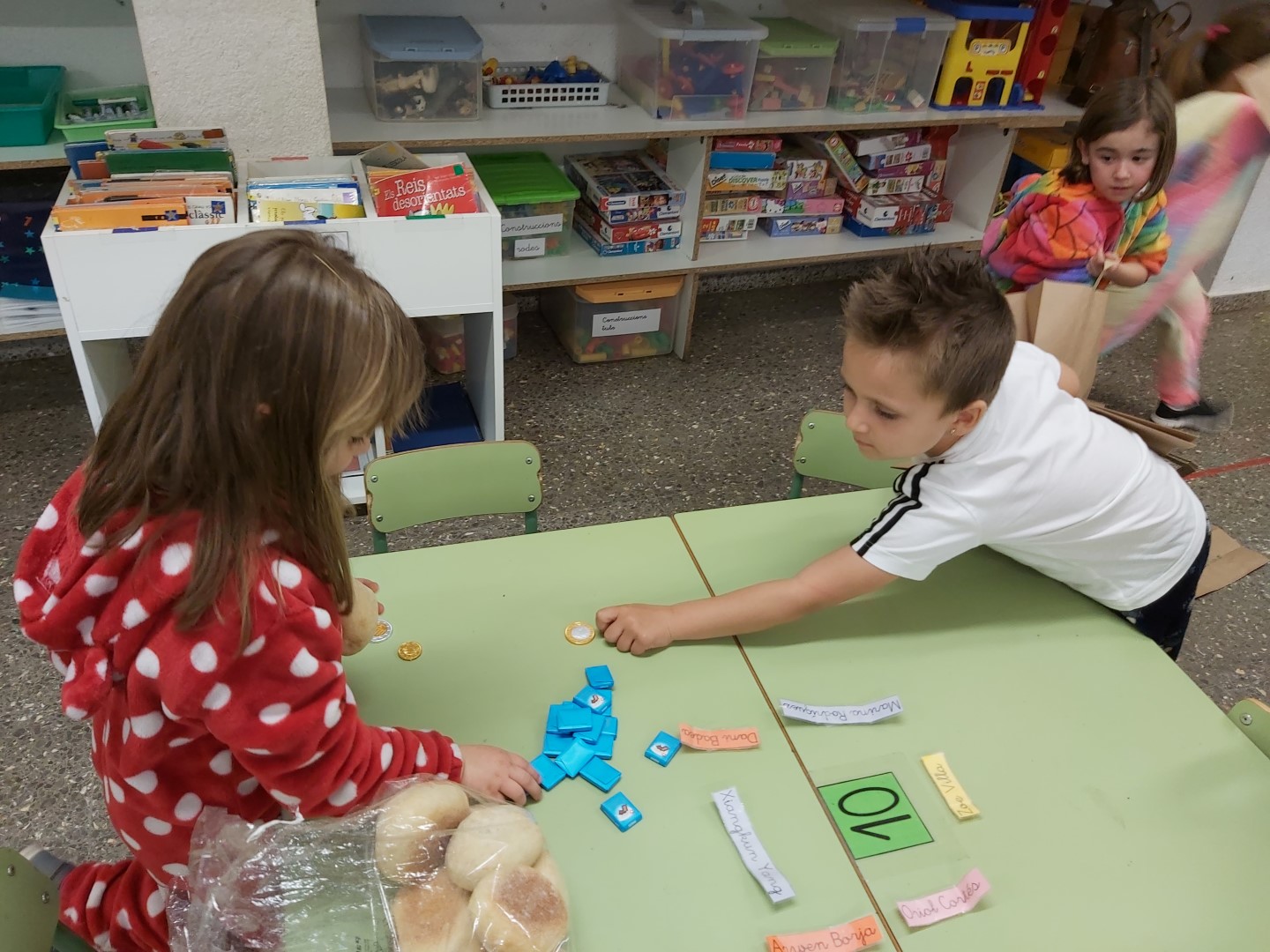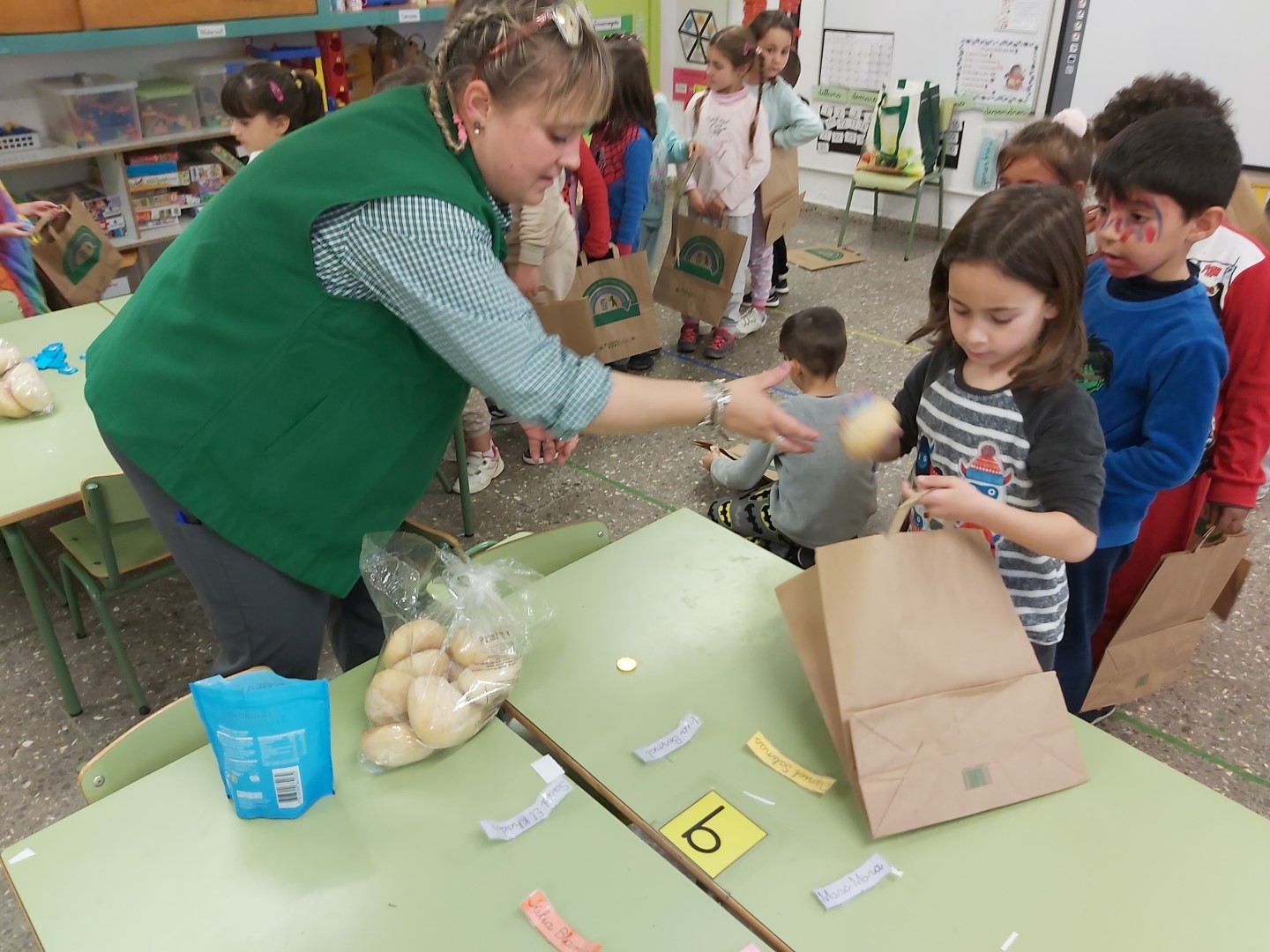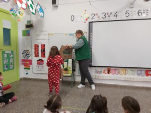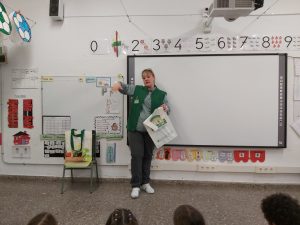 AQUESTA TARDA HA VINGUT LA MONTSE, LA MAMA DE L’ARWEN, A EXPLICAR-NOS EL SEU OFICI. ELLA TREBALLA AL MERCADONA I ESTÀ EN DUES SECCIONS: FENT PA O A LA CAIXA. ENS HA EXPLICAT QUE ELLS/ES ENTREN ABANS PER ENDREÇAR TOTS ELS ALIMENTS, COM ES FA EL PA, COM RECICLEN PER FER LES BOSSES DE PLÀSTIC I DE PAPER I QUE ARA HAN OBERT UNA NOVA SECCIÓ: LA CUINA. DESPRÉS ENS HA REPARTIT UNES MONEDES PERQUÈ POGUÉSSIM COMPRAR PA I XOCOLATA, QUE ENS ENCANTA!