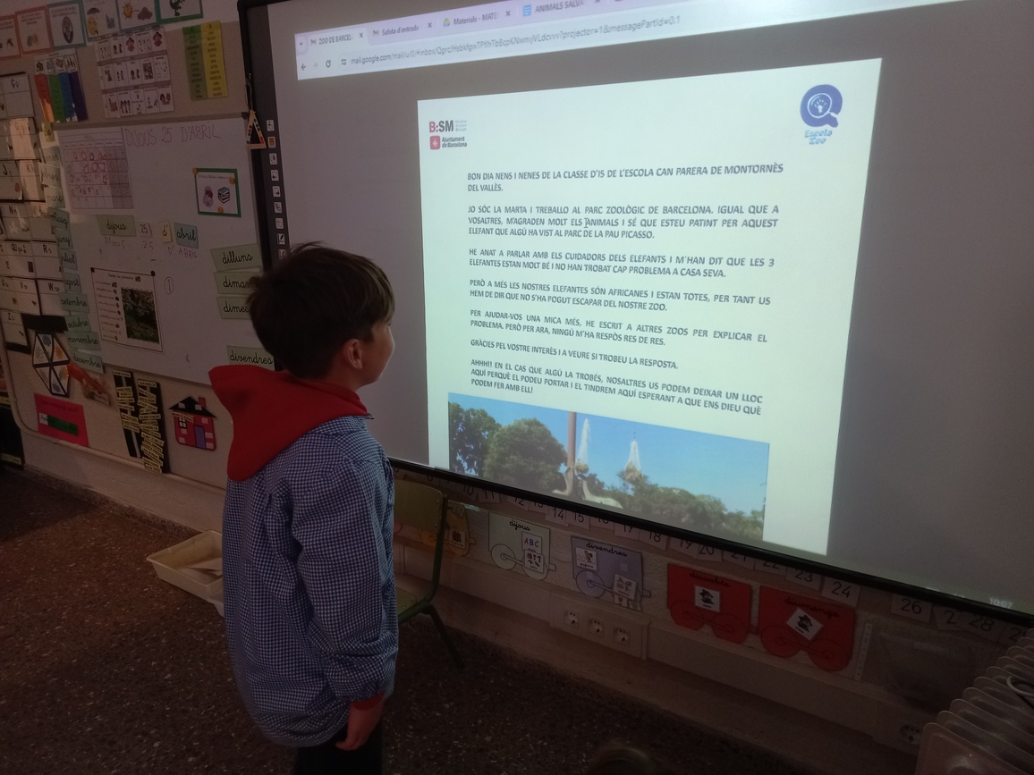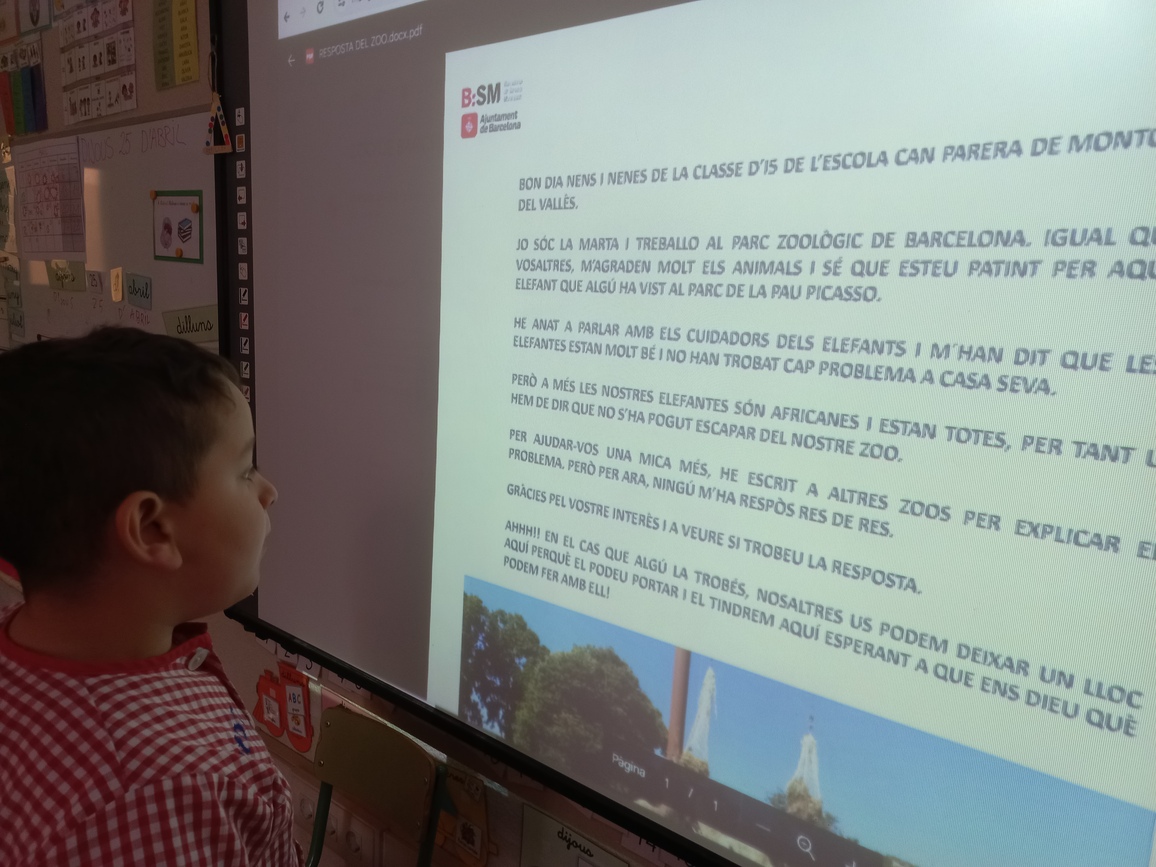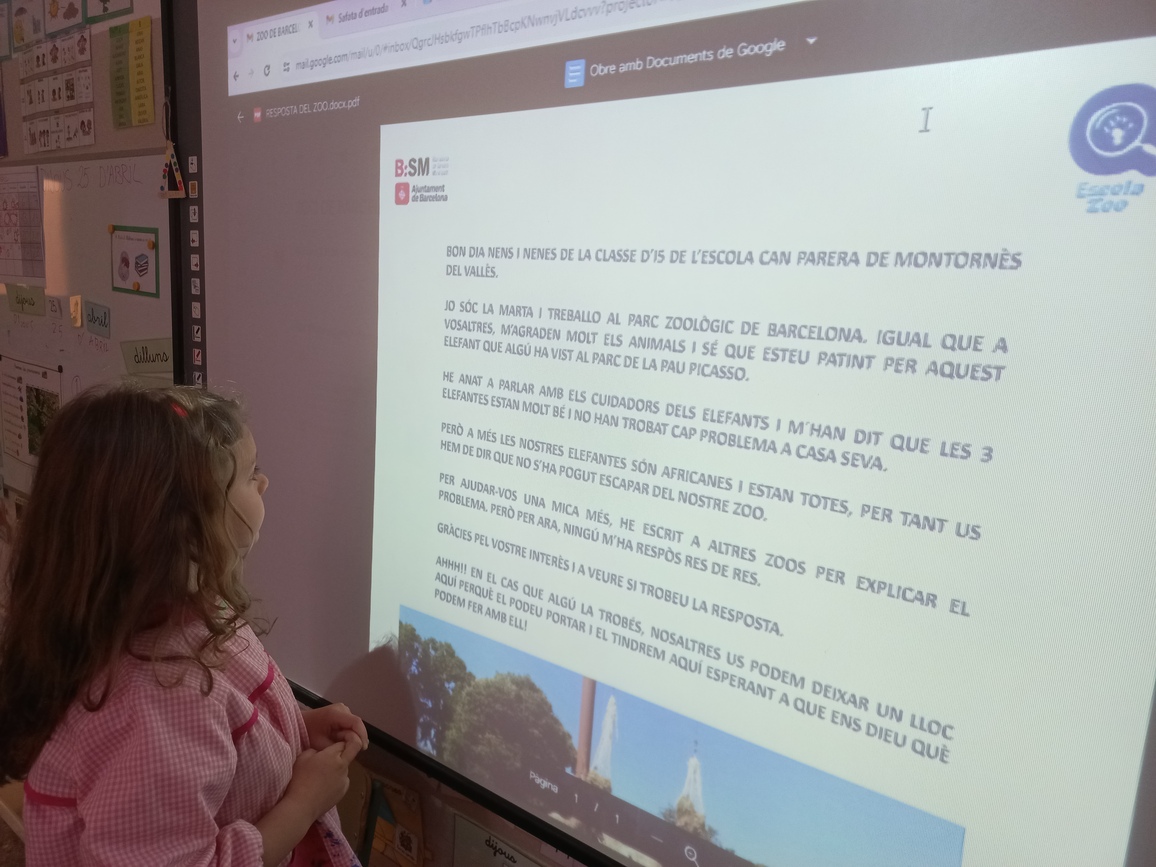 LA MARTA TREBALLA AL ZOO DE BARCELONA I ENS HA EXPLICAT QUE ALLÀ TENEN 3 ELEFANTS, QUE SÓN FEMELLES I SÓN AFRICANES. I QUE PER SORT, ESTAN BÉ TOTES TRES, PER TANT, L’ELEFANT QUE HAN VIST A LA PAU PICASSO NO S’HA ESCAPAT DEL ZOO. IGUALMENT, LA MARTA ENS HA DIT QUE SI EL TROBESSIN, EL PODEM PORTAR CAP AL ZOO FINS QUE AVERIGÜEM D’ON VE AQUEST ELEFANT.