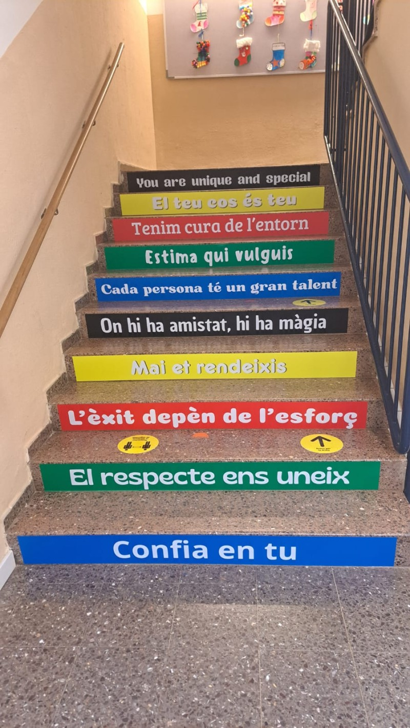 La comissió de coeducació de l’escola ha impulsat la iniciativa de vestir les escales de Primària amb frases coeducatives. L’alumnat de Primària ha participat per triar i/o proposar les frases i aquest és el resultat. Els 5 colors del logo de l’escola ofereixen, a partir d’avui, aquests missatges per fomentar les bones relacions amb l’entorn, les amistats, l’autoestima i la cura pròpia i personal.