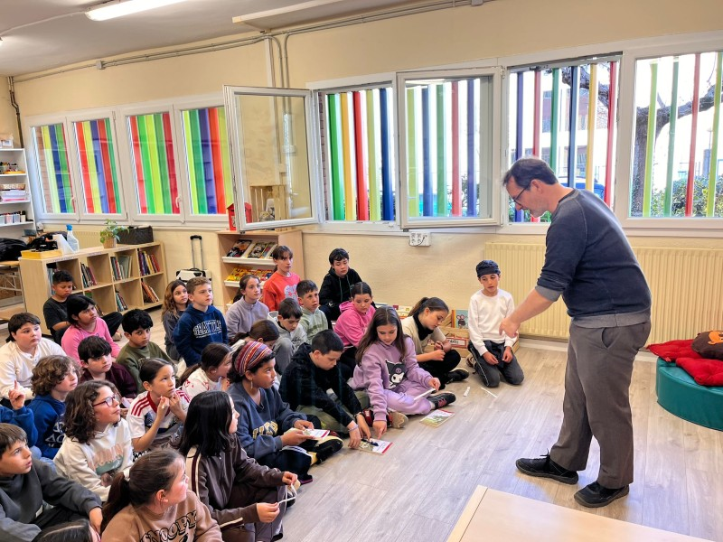 Els infants, que havien llegit el llibre al primer trimestre, van preparar un munt de preguntes: volien saber d’on havia sortit la idea de l’illa, com crea els seus personatges, quant temps triga a escriure una història o com va arribar a ser escriptor. L’Oriol les va anar contestant totes amb molta proximitat i entusiasme, compartint anècdotes i explicant-nos alguns secrets del seu procés creatiu.
