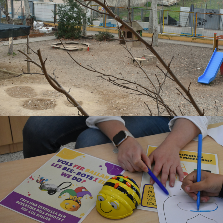 El pati es concep com un espai d’aprenentatge de l’escola, de manera que disposa de diferents zones i materials. Durant el temps d’esbarjo s’ofereixen propostes a l’espai exterior: jocs esportius a la pista, jocs de taula, jocs d’habilitats motrius… i també s’obren alguns espais interiors com el gimnàs, l’atelier, l’espai maker, l’aula de música i la biblioteca per a què l’alumnat explori propostes de joc lliurement.