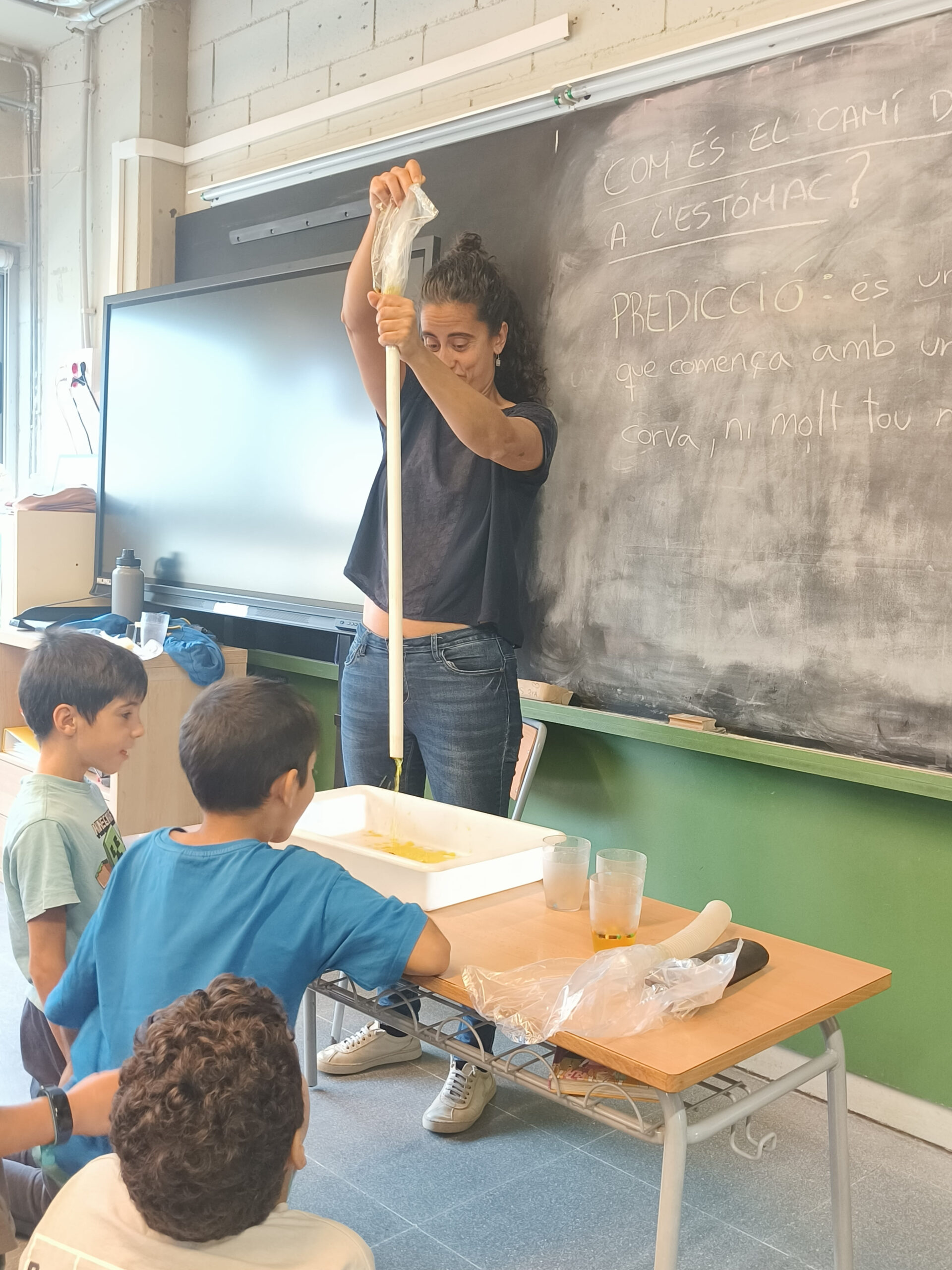 Partint de la pregunta “Quin és el camí dels aliments a dins del cos humà per poder créixer de manera sana?”, hem començat a investigar el funcionament del sistema digestiu tal com ho fan els científics en les seves investigacions. Ens fem preguntes, compartim les nostres idees, obtenim evidències i formulem explicacions científiques. A través de diversos experiments anirem descobrint com és i com funciona cada part del nostre sistema digestiu i perquè és tan important que ens alimentem de forma sana.