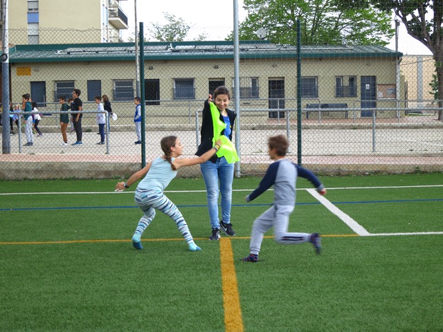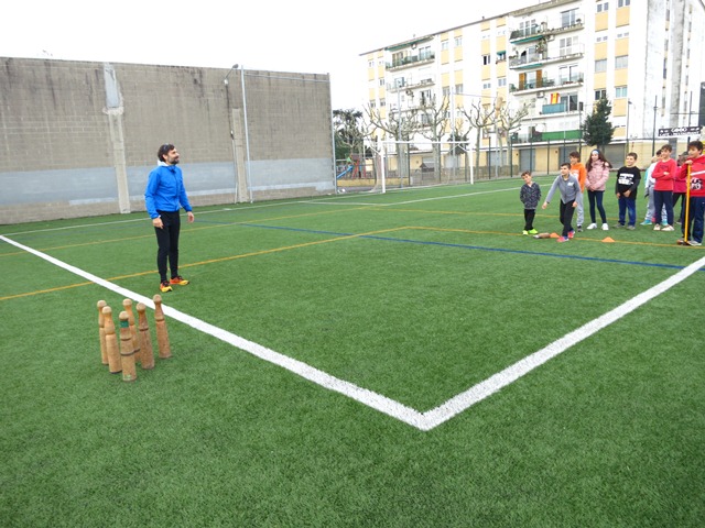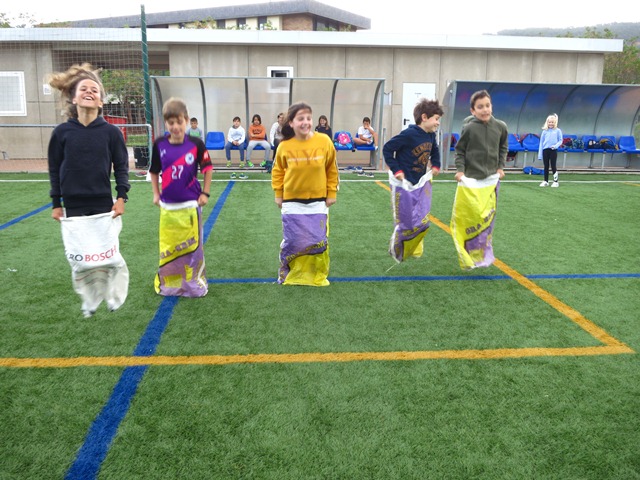 Els més grans (de 2n a 6è), en canvi, ens vam desplaçar fins al camp de futbol i la plaça 1 d’octubre i vam estar practicant jocs populars com: estirar la corda, cursa de sacs, la xarranca, bitlles catalanes… Els/les mestres també van jugar amb nosaltres!