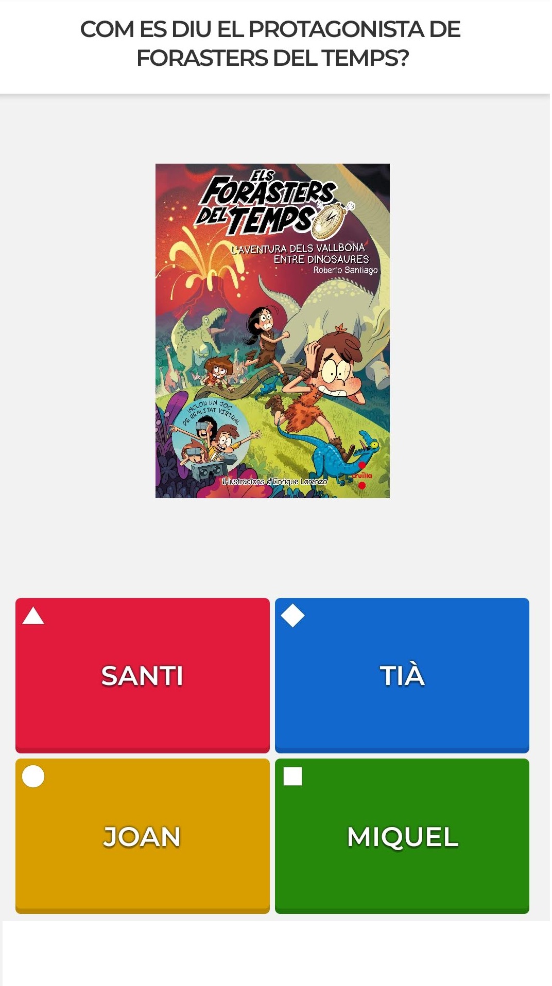 La idea és que penseu una pregunta de qualsevol tema que hàgim treballat aquest curs a l’escola o durant el confinament. Després penseu quatre respostes, on només una d’elles sigui la correcta. Aquí us ensenyo una de les preguntes que hi ha al joc que nosaltres hem creat perquè us serveixi d’exemple: