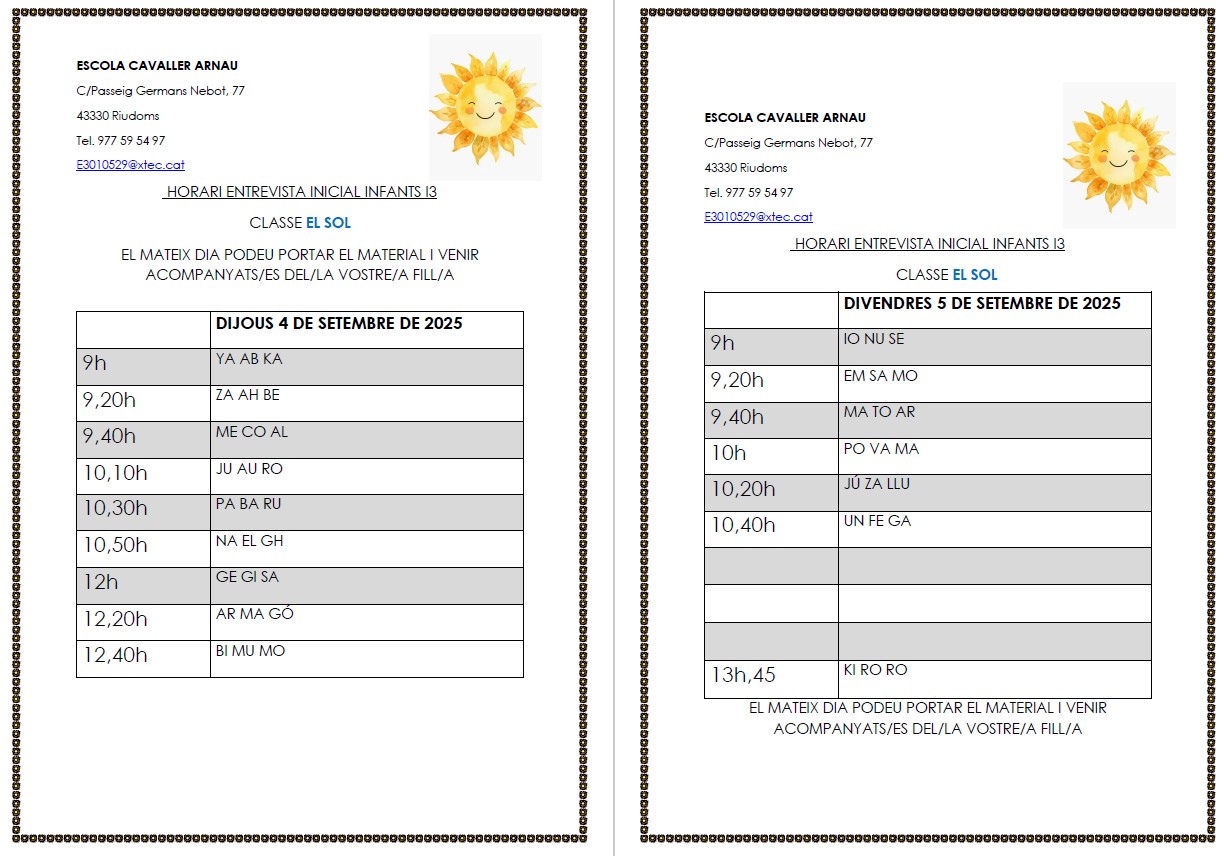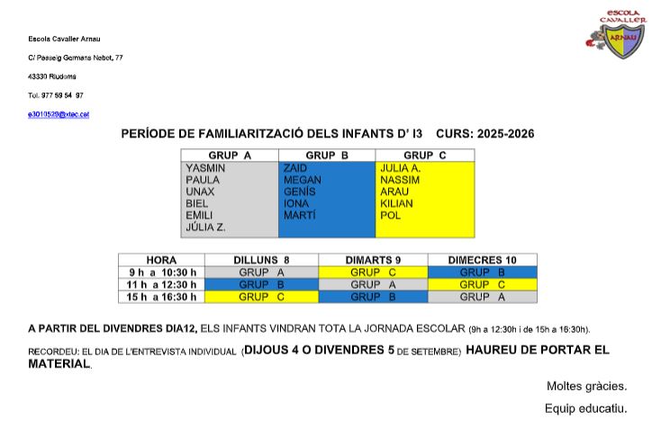 Informació inici de curs dels alumnes d’I3 2025-26. Feu un comentari / Per cavaller / 1 de juliol de 2025 / General Infantil P3 Portada Aquí trobareu les entrevistes inicials i els grups amb l’entrada esglaonada dels alumnes d’I3 del curs 2025-26.