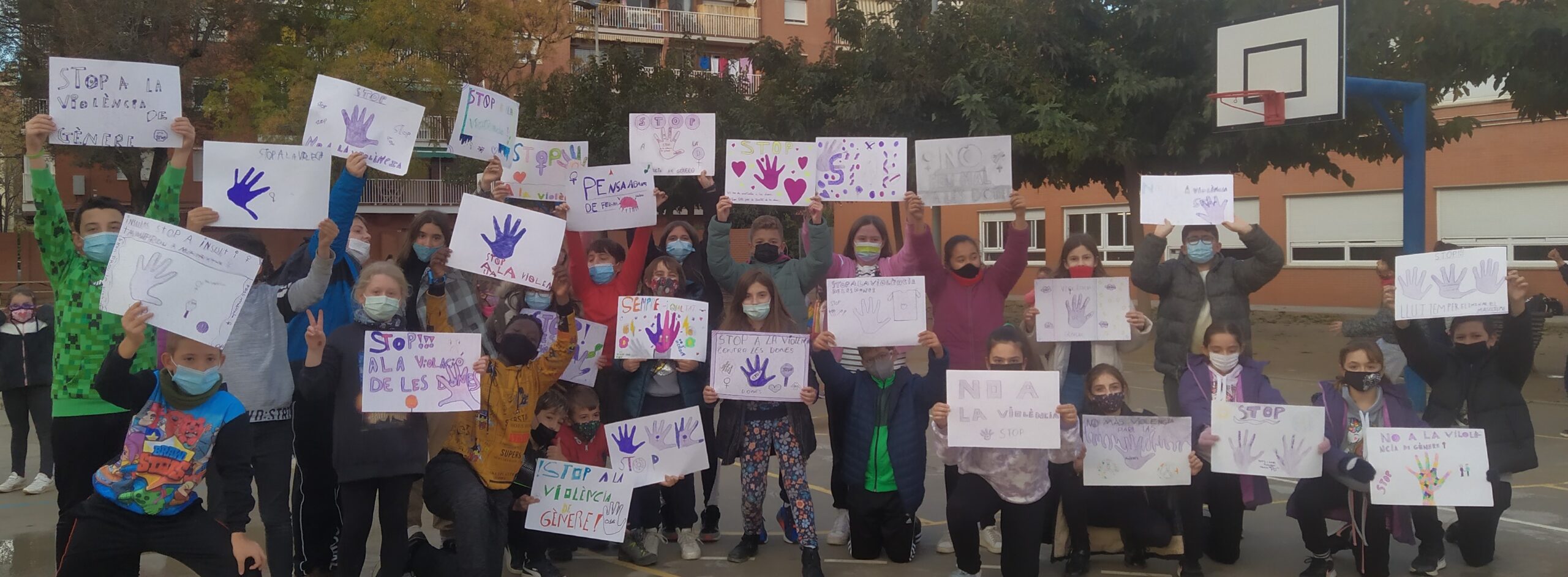 Nosaltres vam fer les pancartes i tot el cole va fer alguna cosa per mostrar el seu rebuig a la violència contra les dones: els nens i nenes de P4 van fer-se una mà lila i se la van posar al cap, els de 2n van fer un llaç gran envoltant quasi tot el seu cos…