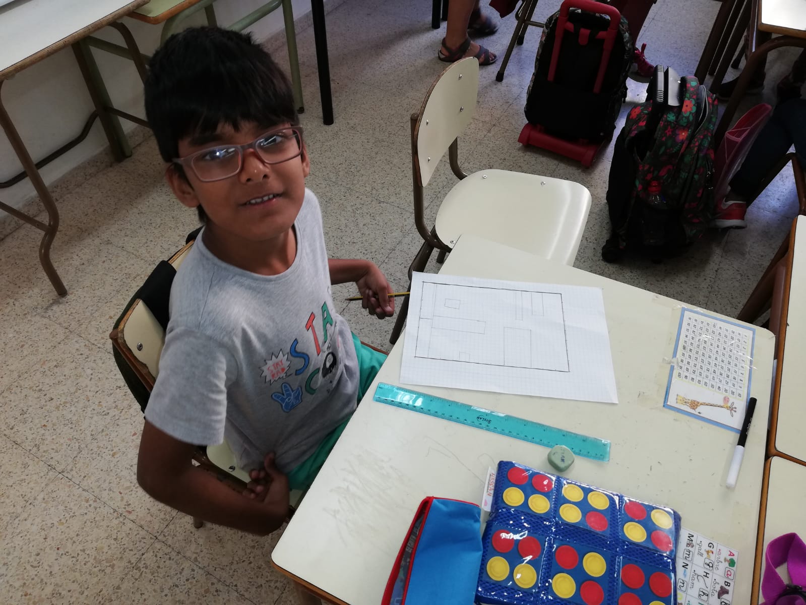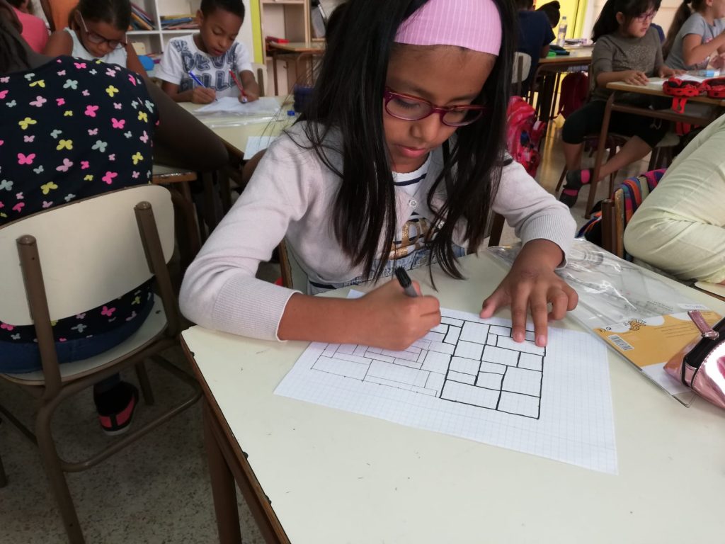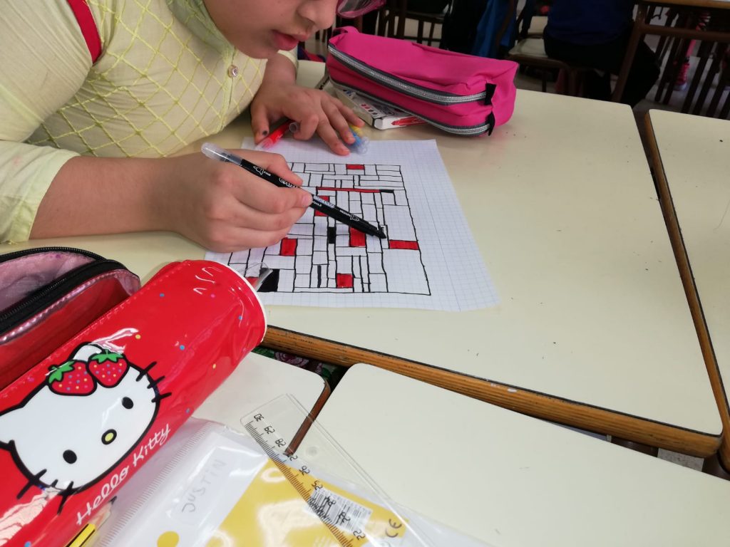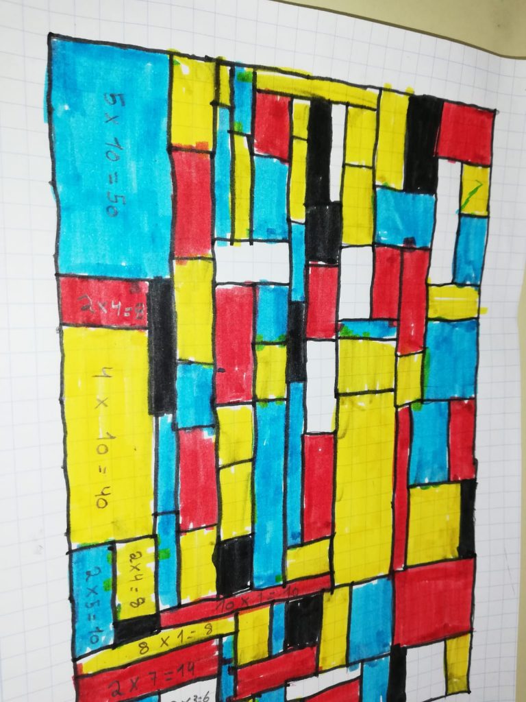 A la classe de 3r hem estat repassant les taules de multiplicar amb un suport gràfic: els quadres del pintor abstracte Piet Mondrian. En el seu full quadriculat, els nens i nenes de la classe han dibuixat amb regle una composició de quadrats i rectangles, seguint l’estil del pintor Mondrian, els han pintat amb els colors que utilitzava el pintor i, després, han comptat quants quadrets d’alçada i amplada ocupava cada rectangle i han escrit a dins la multiplicació corresponent. Una forma de relacionar matemàtiques i art.