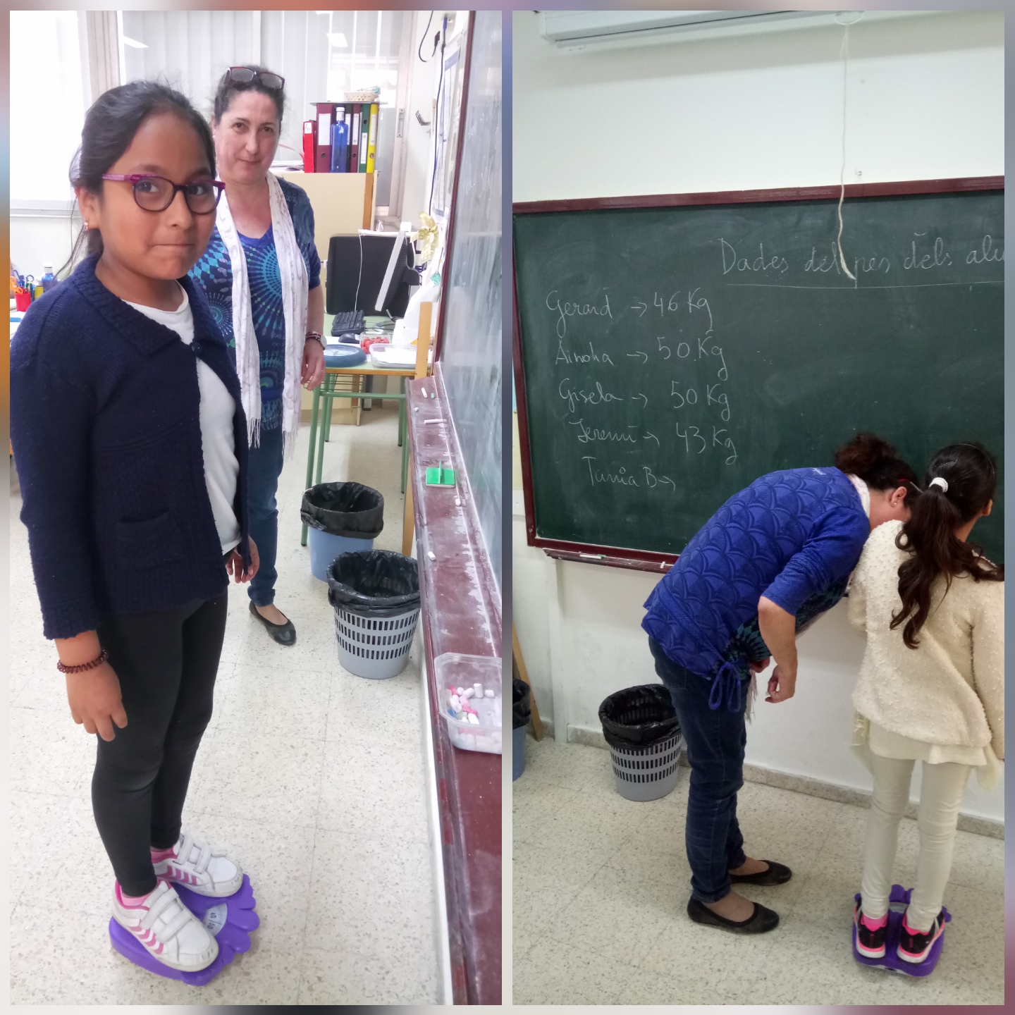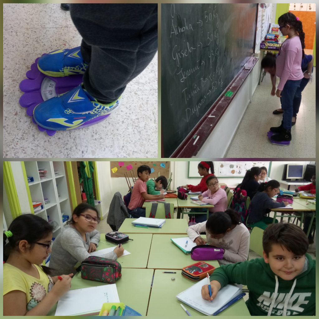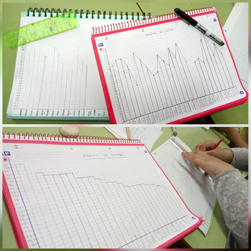 Hi ha moltes formes d’obtenir dades per treballar l’estadística a l’àmbit de les matemàtiques. Els nois i noies de la classe de 4t ho estan fent a partir del pes en quilograms de tots i cadascun dels membres de la classe. Tots han passat per la bàscula, com es pot veure a les imatges. Un cop anotat el pes de tothom i ordenades les xifres de major a menor quantitat de quilograms, ens han servit per elaborar diversos tipus de gràfics -com el de línies i el de barres- que ens permetran treballar conceptes matemàtics com el de mitjana i el de tendència.