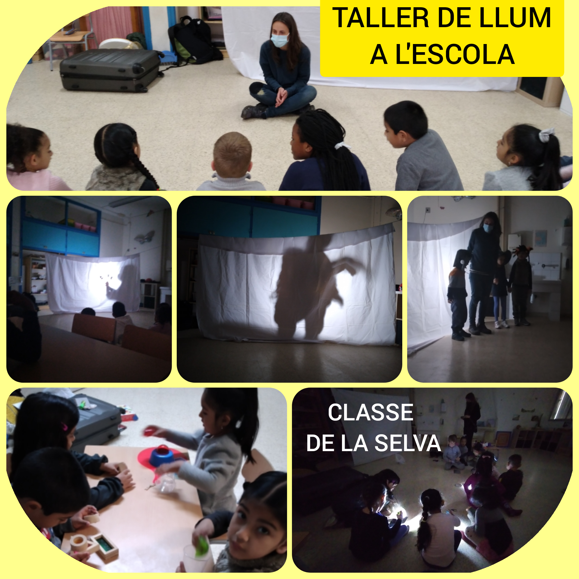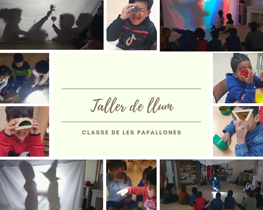 Els nens/es d’Infantil hem fet un taller de llum a l’escola. Hem conegut a la Clara i ens ha demostrat una manera de fer ombres amb l’ajuda d’un projector i un llençol, a més a través de diferents propostes i materials hem gaudit molt jugant amb la llum.