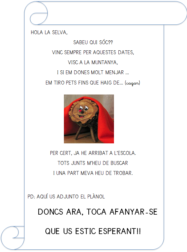 La setmana passada ens va arribar una carta a les aules d’infantil. I… sorpresa la nostra… era… l’arribada del tió!!!!!!!!!!!!! Es veu que va baixar de la muntanya i es va amagar per l’escola. Per aquest motiu ens va deixar un mapa i una carta amb una explicació per a que el busquéssim. Mireu, mireu…