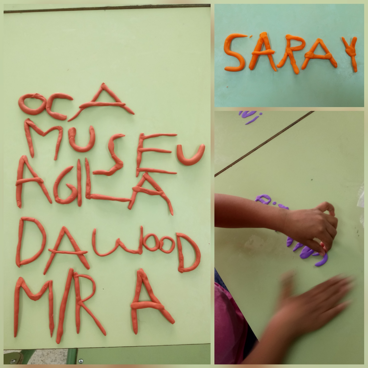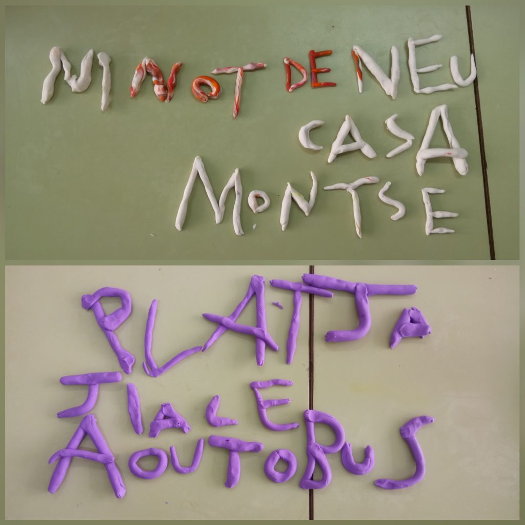 DIMECRES 16 DE MAIG: mireu com els nens i nenes de la Classe dels Planetes (P5) practiquen la seva habilitat com a escriptors, confegint paraules amb lletres de plastilina:
