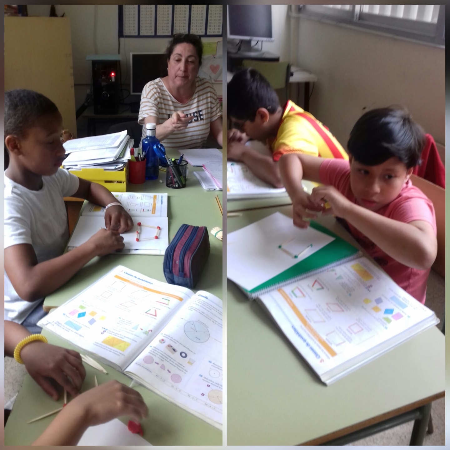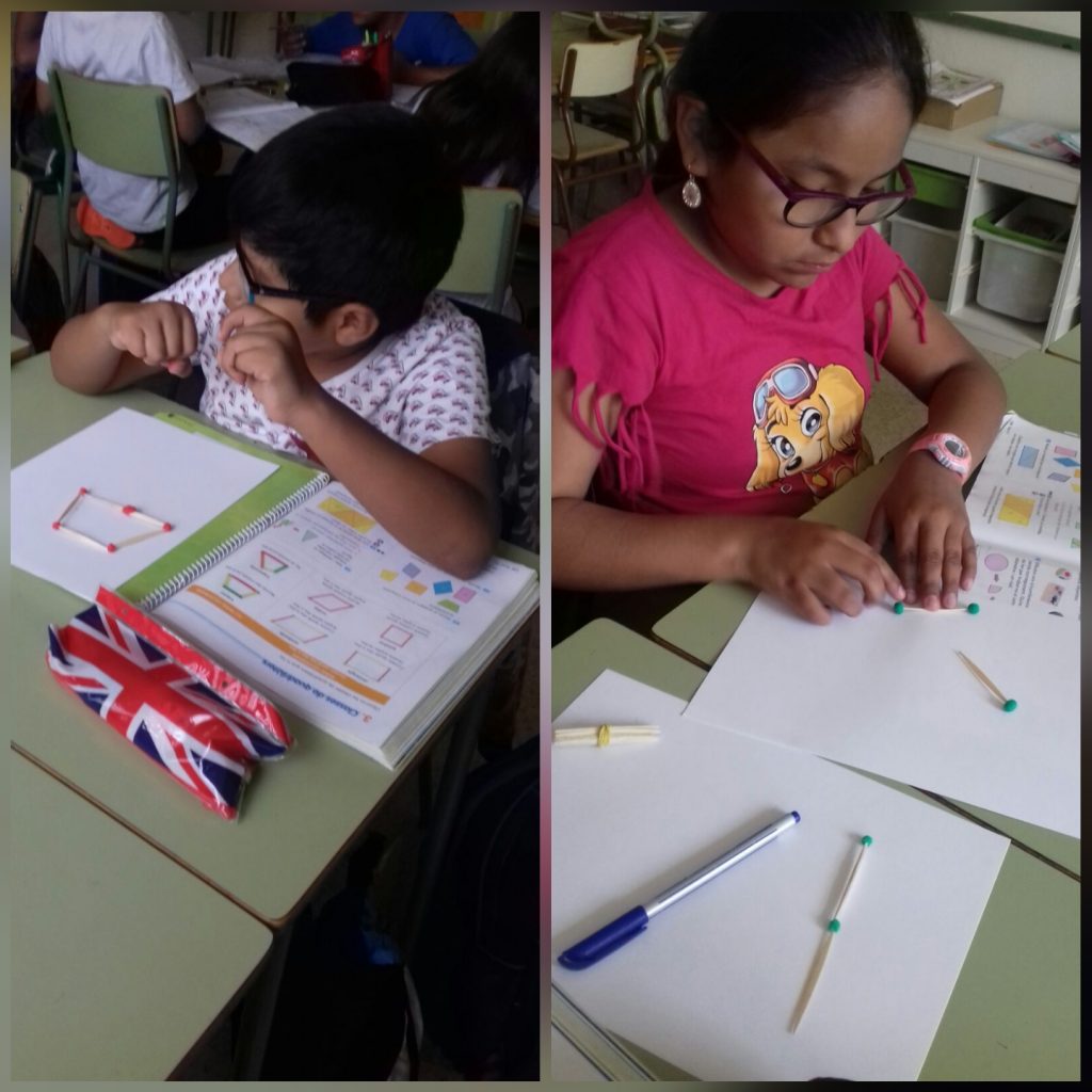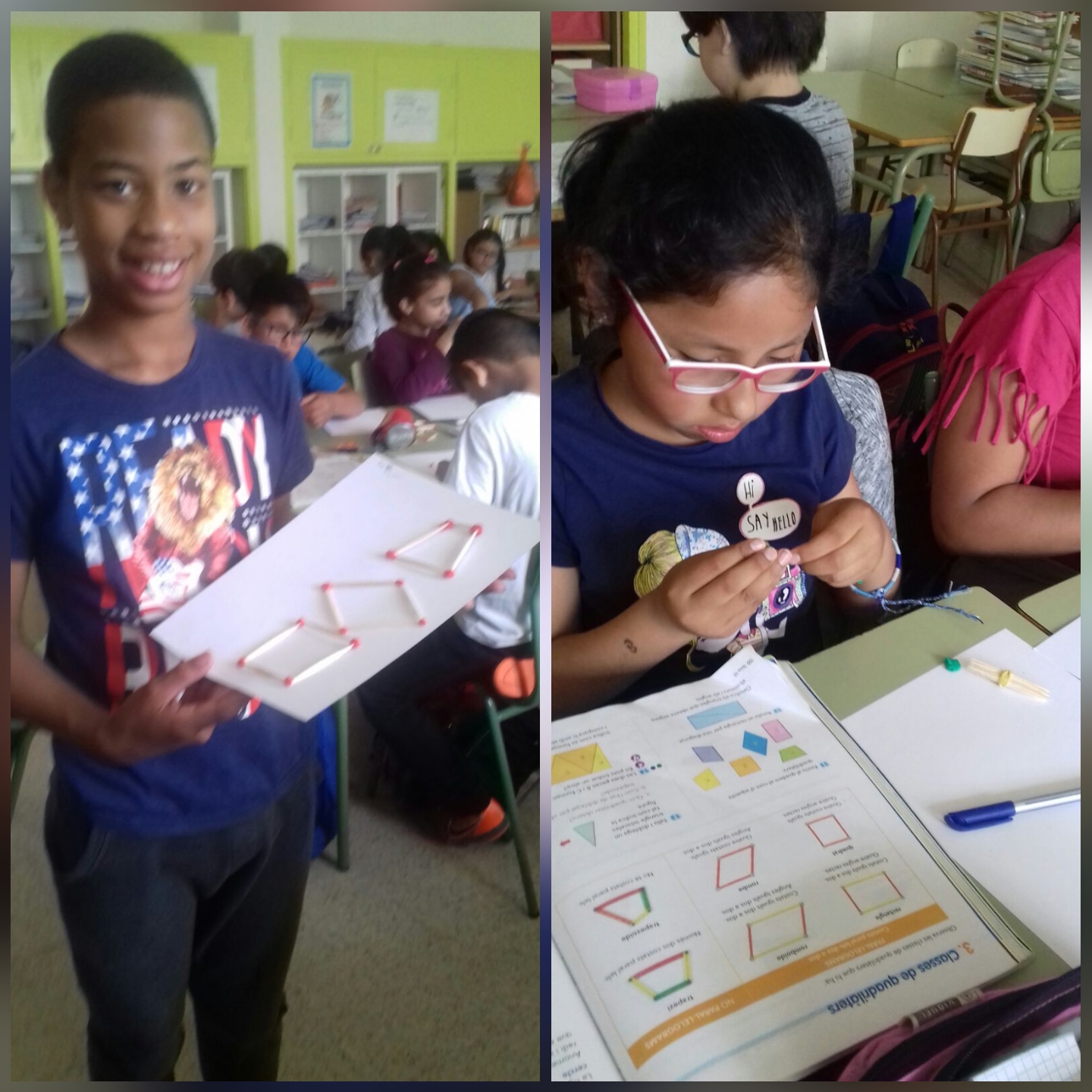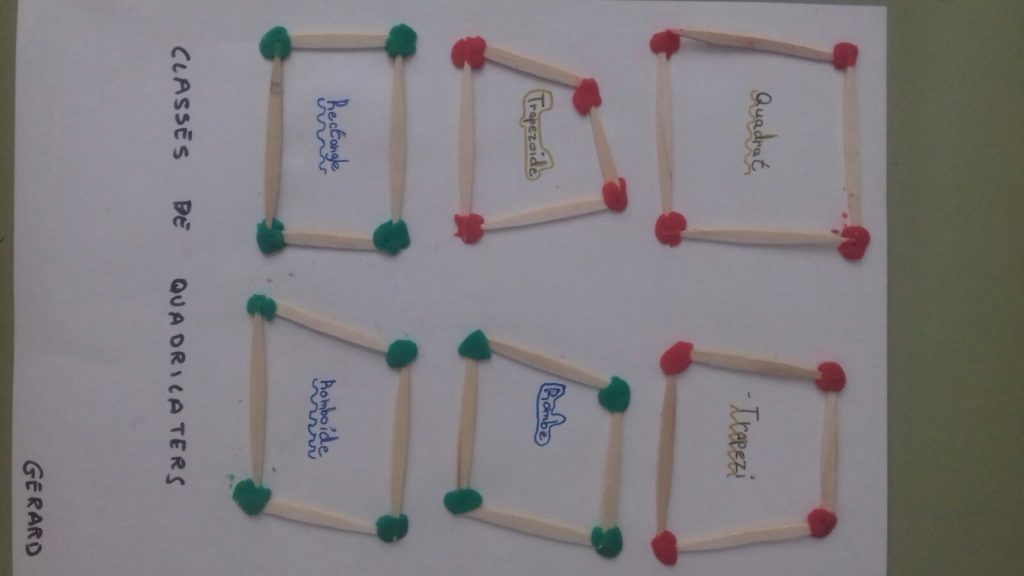 El mateix dijous, els nois i noies de la classe 4t estudien les figures geomètriques de forma vivencial i manipul·lativa, elaborant diferents classes de quadrilàters (quadrat, trapezi, trapezoide, rectangle, rombe i romboide) amb escuradents i plastilina:
