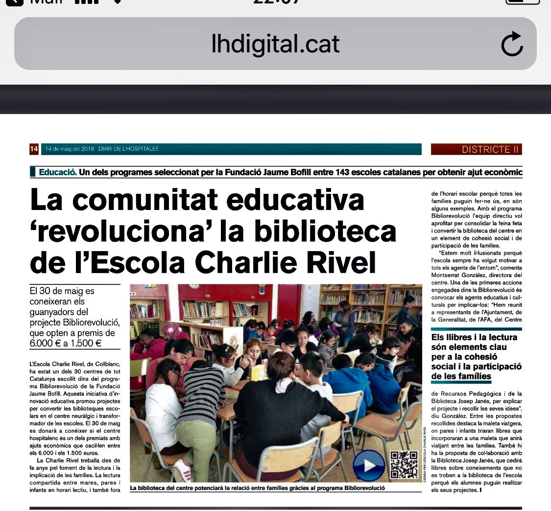 DILLUNS 14 DE MAIG: per començar la setmana amb energia, l’EScola Charlie Rivel apareix de nou als mitjans de comunicació de la ciutat. En aquest cas, es tracta d’una notícia a “L’Hospitalet. Diari informatiu” i al web www.lhdigital.cat que parla del projecte de Biblio(r)evolució que s’està desenvolupant a la nostra escola des de fa unes setmanes. Aquesta és la notícia: