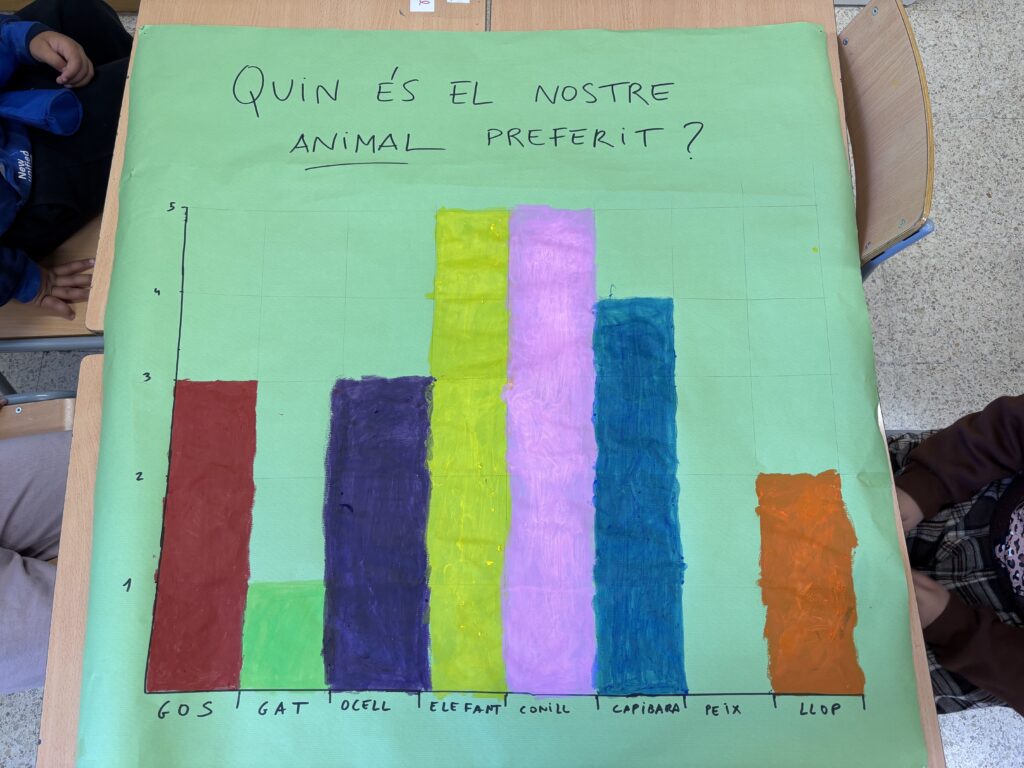 A 3r s’ha treballat el pensament estocàstic a través d’una investigació estadística completa. L’alumnat ha decidit la pregunta (quin és el nostre animal preferit?), ha recollit dades i les ha representat amb gràfics de barres. Un cop acabada, han compartit la investigació amb una altra escola. També han analitzat la investigació rebuda, interpretant els gràfics i comparant-los amb els seus. Les converses han estat clau per entendre millor la informació.