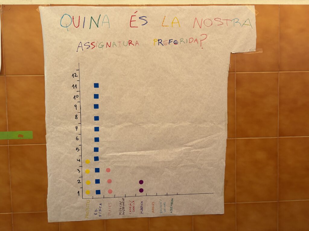 A 4t l’alumnat ha dut a terme una investigació estadística a partir d’una pregunta consensuada: quina és la nostra assignatura preferida?. Han recollit dades, les han organitzat en taules i les han representat amb un gràfic de barres. Un cop preparada, han enviat la investigació a una altra escola. També han analitzat la investigació que han rebut, interpretant els resultats i fent comparacions amb les seves pròpies dades.