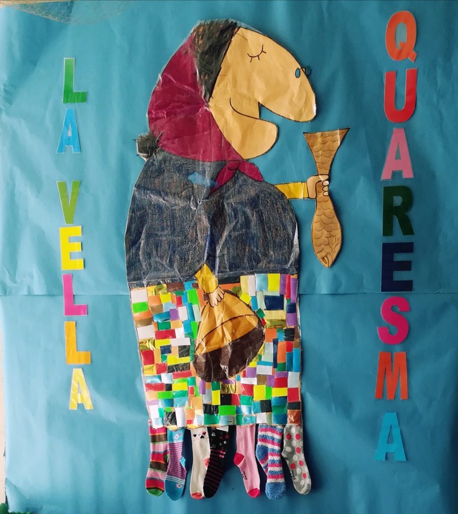 El rei Carnestoltes ha marxat i la Vella Quaresma, seria, avorrida… ha arribat. Benvinguda senyora! Es quedarà 7 setmanes, com les 7 cames que té i ens ha explicat, que si cada setmana un ingredient per la mona volem, una norma haurem de complir: cuidar dels amics/es, treballar tranquils… Ah! I cada setmana perquè al