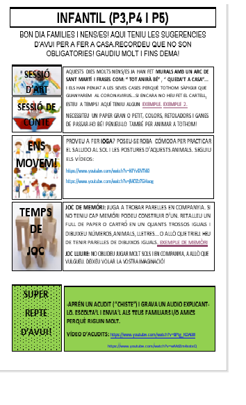 Bon dia famílies i nens/es d’infantil! L’equip de mestres d’infantil us trobem molt a faltar i esperem que esteu jugant molt i compartint moltes estones boniques amb les vostres famílies. Esteu ajudant al pare, la mare…amb les tasques de casa també? Segur que sí, perquè ja sou molt grans! Com ara ja sabeu que tots/es,