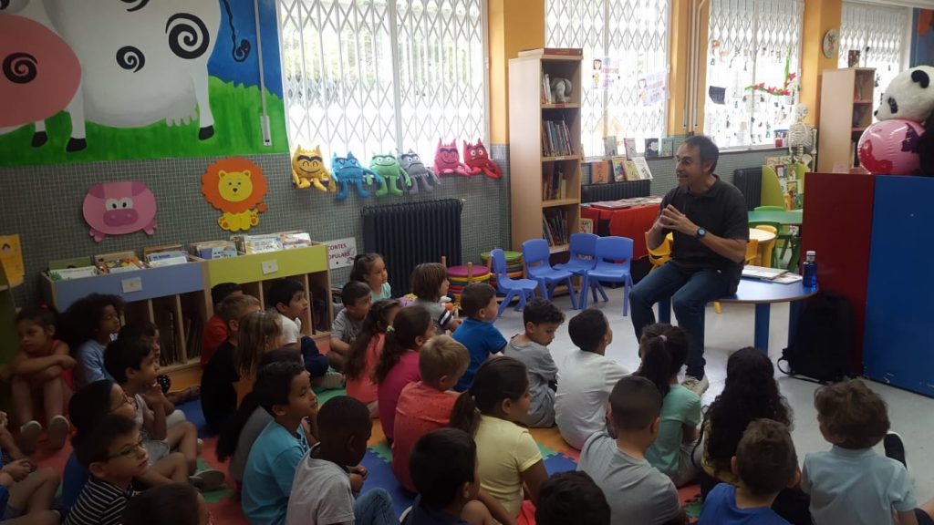 Durant la seva visita, ens va explicar que és bibliotecari i que l’afició per escriure va néixer pel seu interès pels llibres i per la lectura. L’alumnat de 1r va tenir l’oportunitat de fer-li moltes preguntes sobre la seva experiència com a escriptor i com a crític. Ens va parlar sobre els seus inicis, sobre les estratègies que utilitza per a imaginar un argument i, fins i tot, ens va ensenyar les seves ulleres especials per descobrir tot allò que el pot ajudar a construir una bona historia.