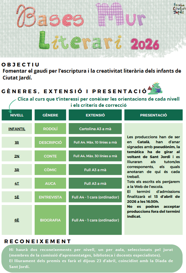 Sant Jordi – Bases Mur literari 2026 Bloc313/03/26 Estimada comunitat, a continuació disposeu de les bases del Mur literari 2026. Per accedir-hi, cliqueu a la imatge de sota i, una vegada obert el document, pitgeu al nivell del que voleu conèixer més informació.