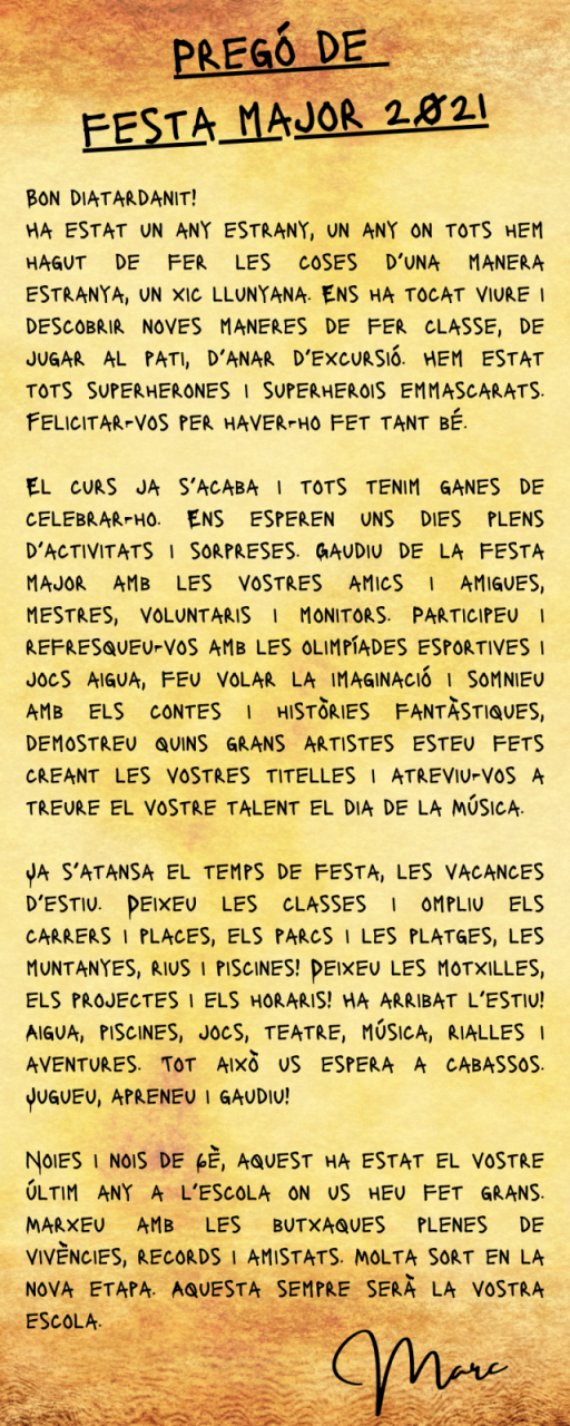 Festa Major 2021 Escola17/06/21 El passat 15 de juny començà la nostra fantàstica festa major, el Marc ha estat el nostre pregoner oficial acompanyat de la gegantona Flor, la pubilla, l’hereu i la música en directe, ha marcat l’inici d’aquests dies plens d’activitats.