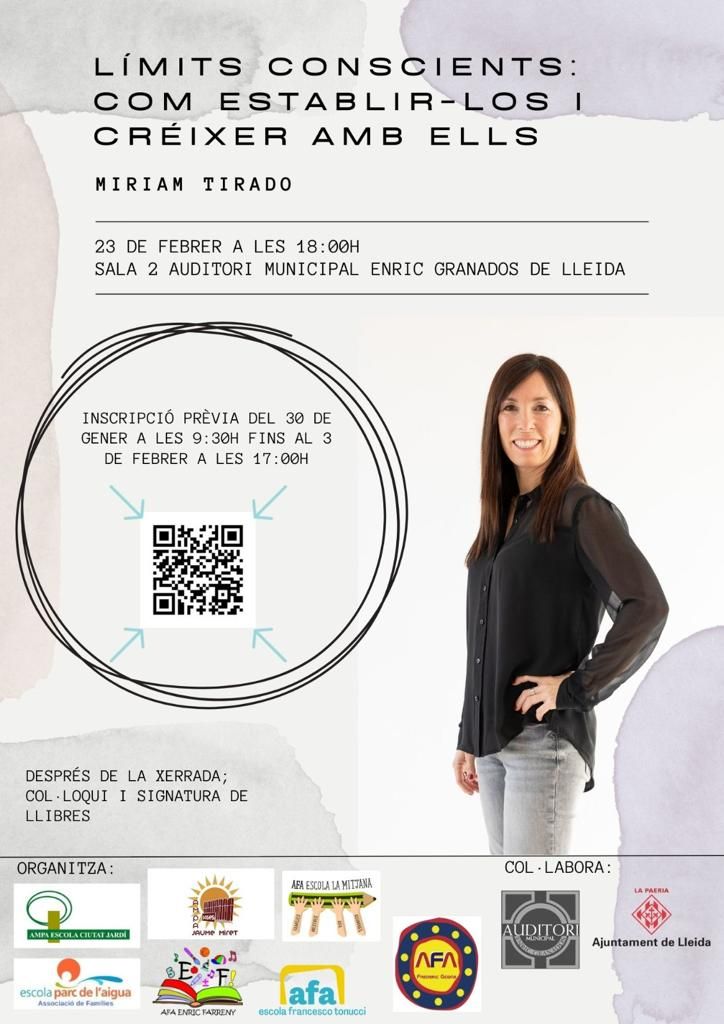 Ens plau informar-vos que entre diverses AMPA’s i AFA’s de Lleida i província estem preparant amb molta il·lusió una Xerrada de la Míriam Tirado sobre els “Límits”, que tindrà lloc el proper 23 de febrer a les 18h.