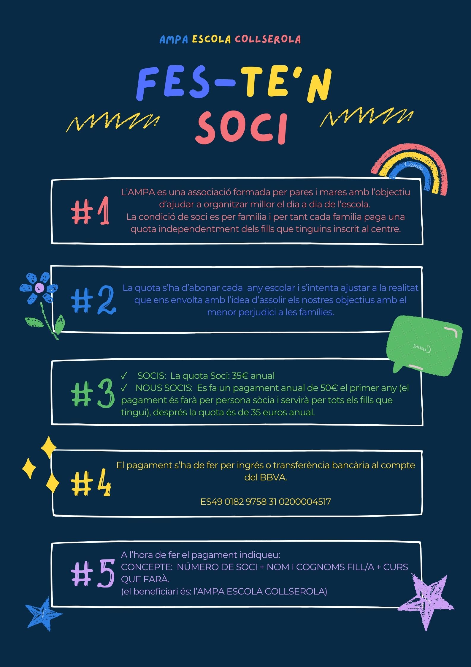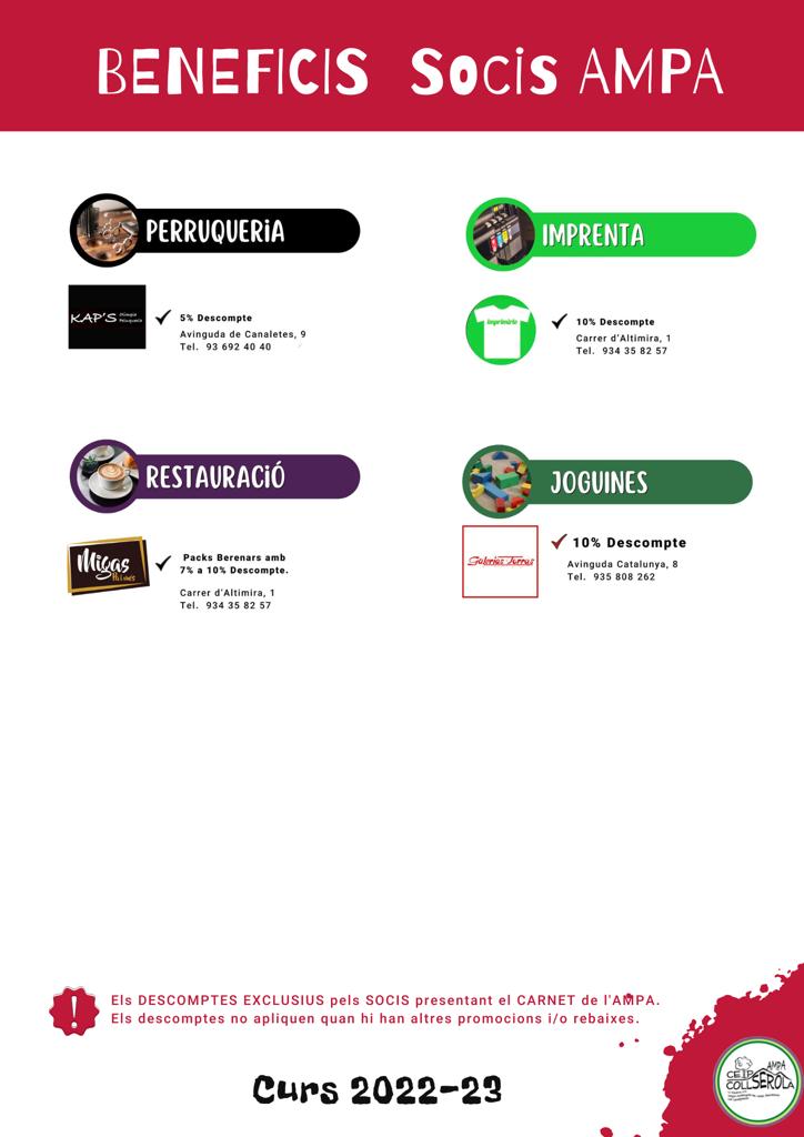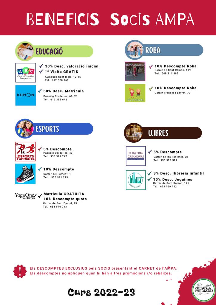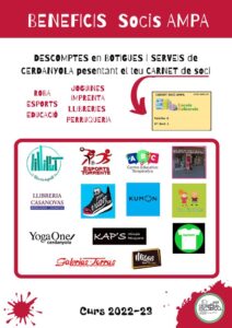 La quota de soci permet a l’AMPA dur a terme totes les activitats que oferim a l’escola, extraescolars, menjador, acollida, biblioteca, etc, així com ajudar a l’escola en tot allò que ens es possible (compra llibres, material audivisual, etc).A més, el fet de ser soci comporta unes aventatges com per exemple millor preu en les extraescolars, servei de menjador, etc…