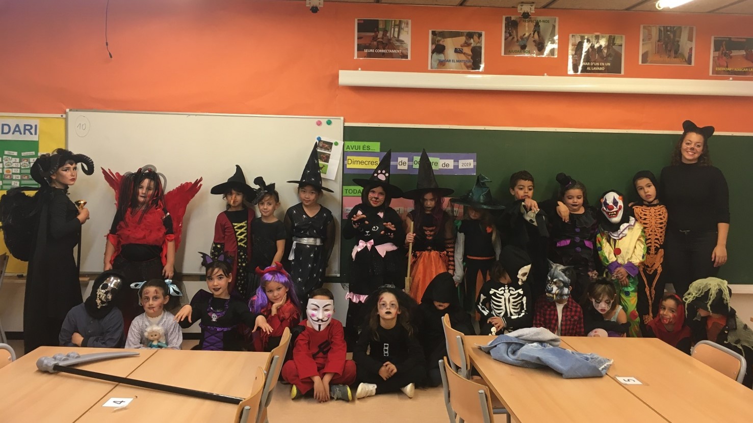 A la tarda ens vam disfressar per celebrar Halloween amb tots els companys i companyes de Primària. Primer cada classe havia preparat una coreografia i després tots vam ballar la cançó conjunta. Ens ho vam passar molt bé!
