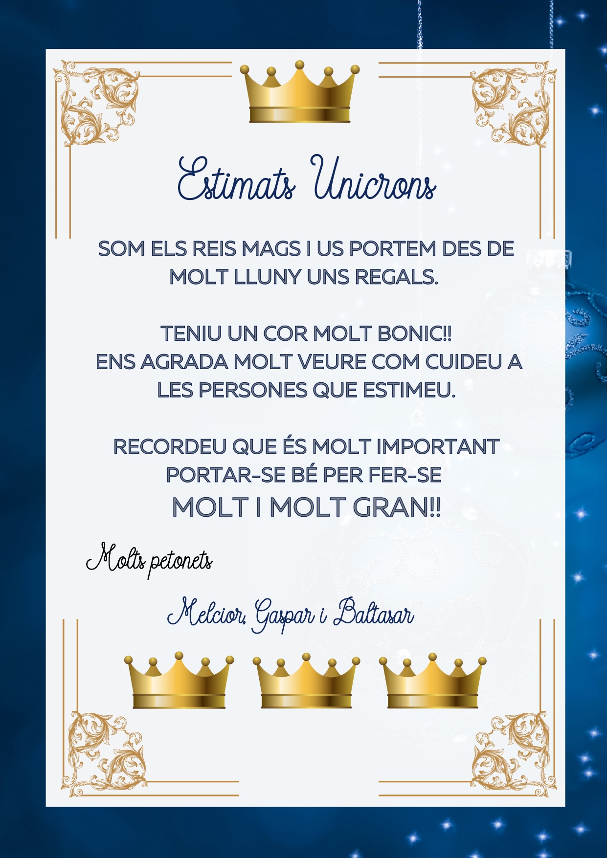 Tornant de les vacances de Nadal ens hem trobat una sorpresa, els reis també havien passat per la classe dels Unicorns. Amb molta emoció i paciència hem esperat a que tots estiguéssim en rotllana, i hem anat obrint els regals, dos puzzles, un joc de per comptar i obrir portes,un conte, un pastís per celebrar els aniversaris a la classe, i una batedora pel racó del joc simbòlic. Hem pogut gaudir jugant , a més a més , ens han deixat una carta. cliqueu a sobre i veureu les fotos.