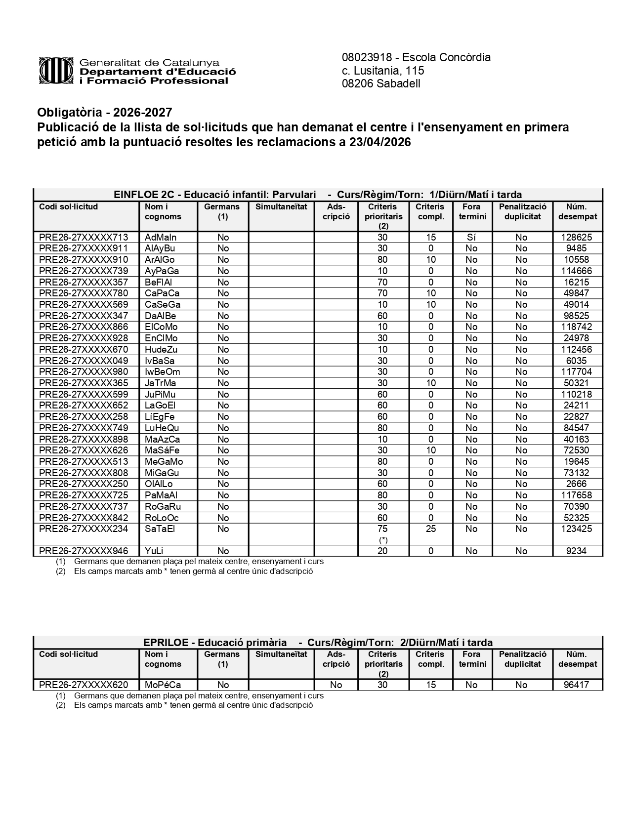 Aquí trobareu tota la informació relativa al procés de preinscripció i matrícula per al curs 26-27. Anirem actualitzant l’article en funció dels processos a realitzar.