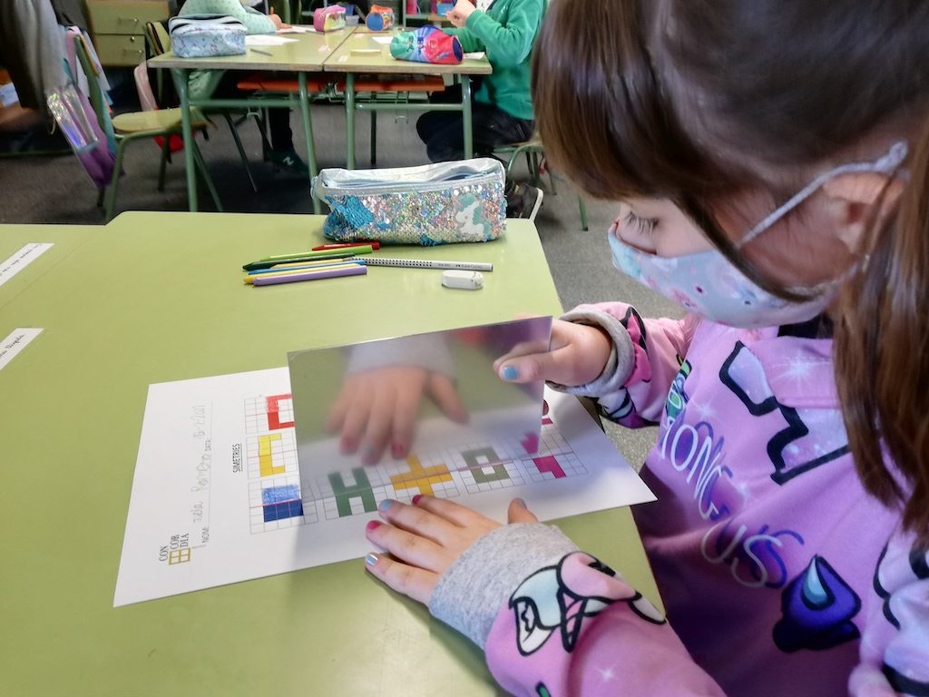 El concepte de simetria és complexa i a vegades ens costa veure quin és l’eix o els eixos de simetria d’un objecte, un dibuix o, fins i tot, del propi cos. Avui hem gaudit creant dibuixos abstractes simètrics i experimentant amb un mirall.