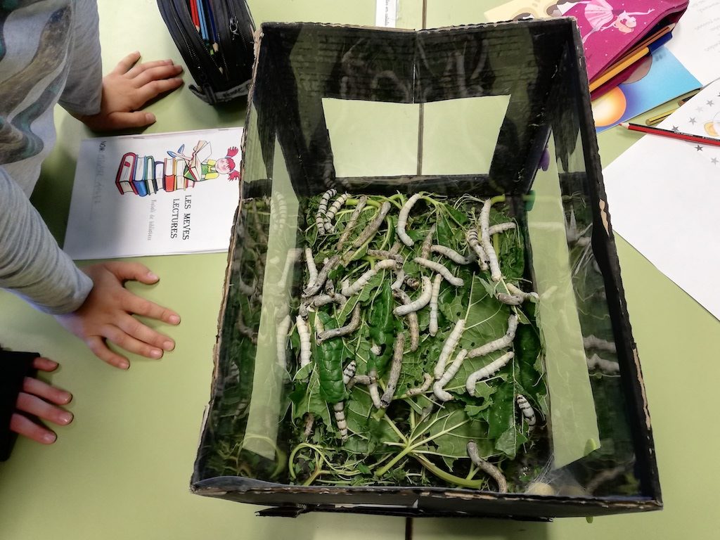 Els nens i nenes de 6è tenen cucs de seda a la classe i ens els han deixat. Ha estat molt divertit observar-los de ben a prop i anar descobrint com són. Alguns de nosaltres no els havíem vist mai. Hem pensat que cada divendres els anirem a buscar per poder veure l’evolució.