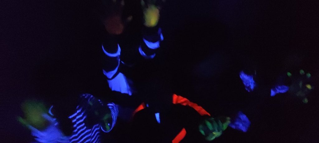 AMB REROLADORS FLORESCENTS ENS HEM PINTAT LES MANS. ELS COLORS NOMÈS ES PODEN VEURE   A LES  FOSQUES I AMB LA LLANTERNA QUE  FA LLUM NEGRE.
