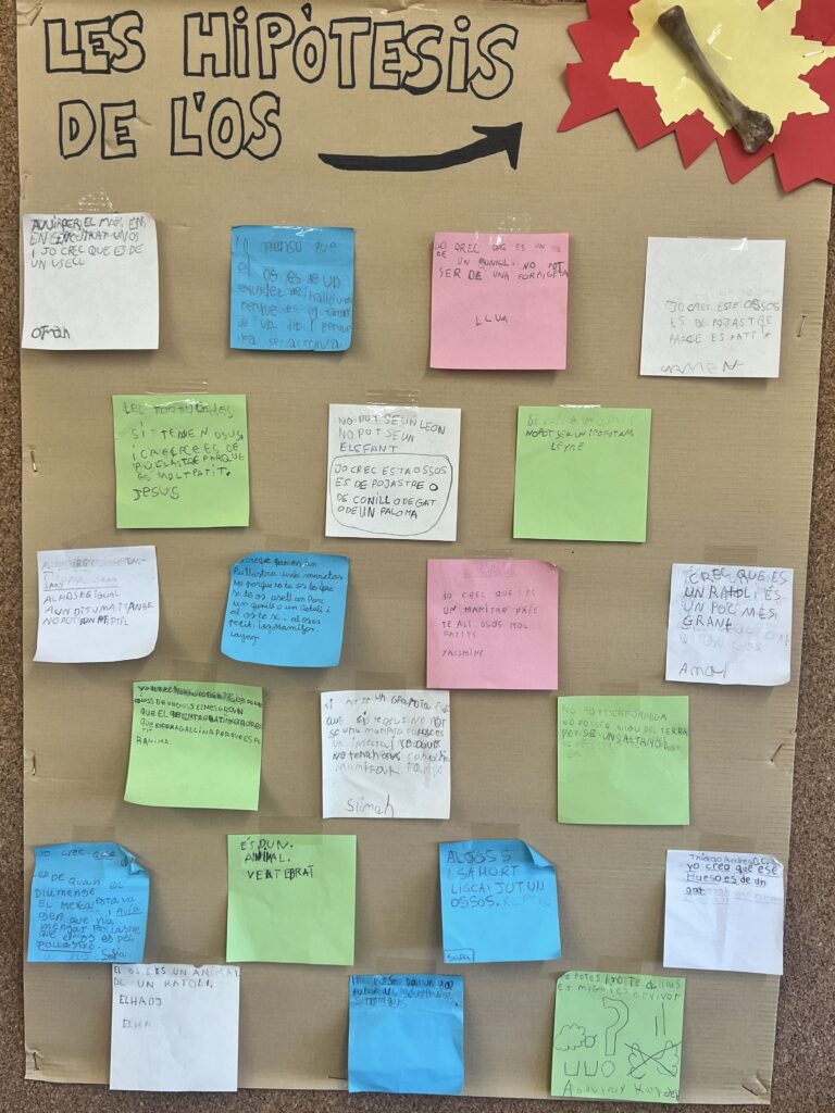 Ens vam posar en rotllana i vam començar a fer les nostres hipòtesis creant un mural per penjar a la classe. A partir d’aquí hem fet activitats de classificació, d’investigació, artístiques… i hem après mooooolt sobre els ANIMALS VERTEBRATS. Ho voleu veure?