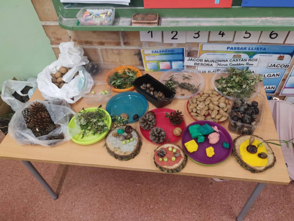 EL DIA 13 DE NOVEMBRE, APROFITANT QUE ELS COMPANYS/ES DE L’AULA 2 TENIEN SORTIDA AMB ELS GRANS DE L’ESCOLA ANTONI BERGÓS, ENS VAM ANIMAR A PASSAR EL MATÍ AMB ELS NENS I NENES DE LA CLASSE DELS CARAGOLS I VAM COMPARTIR UN MATÍ BEN VARIAT. VAM FER UN TALLER D’ART EFÍMER AMB ELEMENTS DE LA