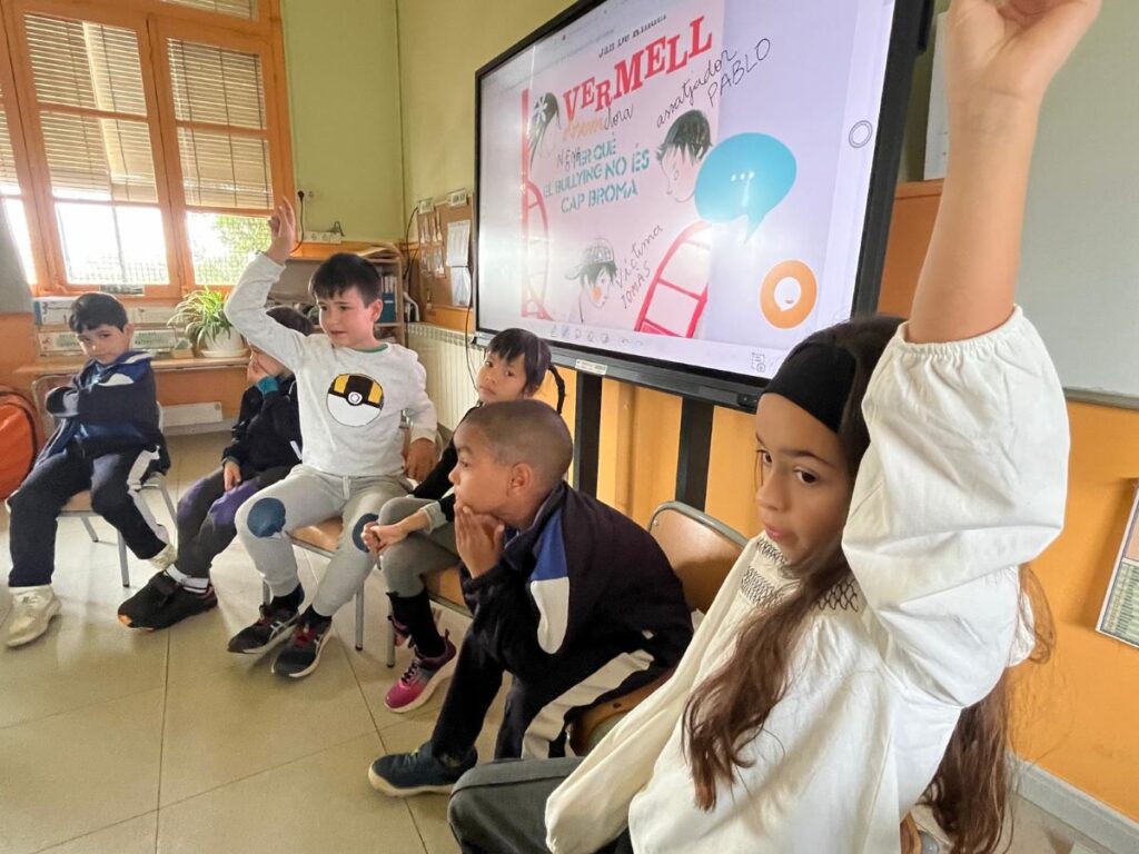DINS DEL PROJECTE DE CONVIVÈNCIA, HEM TREBALLAT EL TEMA D’EDUCACIÓ SOCIOEMOCIONAL I LA GESTIÓ POSITIVA DELS CONFLICTES A TRAVÉS DEL CONTE “VERMELL o per què el bullying no és cap broma” de Jan de Kinder de l’editorial Tramuntana AQUEST CONTE ENS PARLA D’UNA MANERA CLARA I DIRECTA DE L’ASSETJAMENT ESCOLAR. ENS HA AJUDAT A REFLEXIONAR