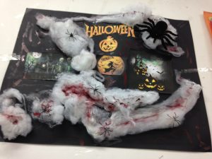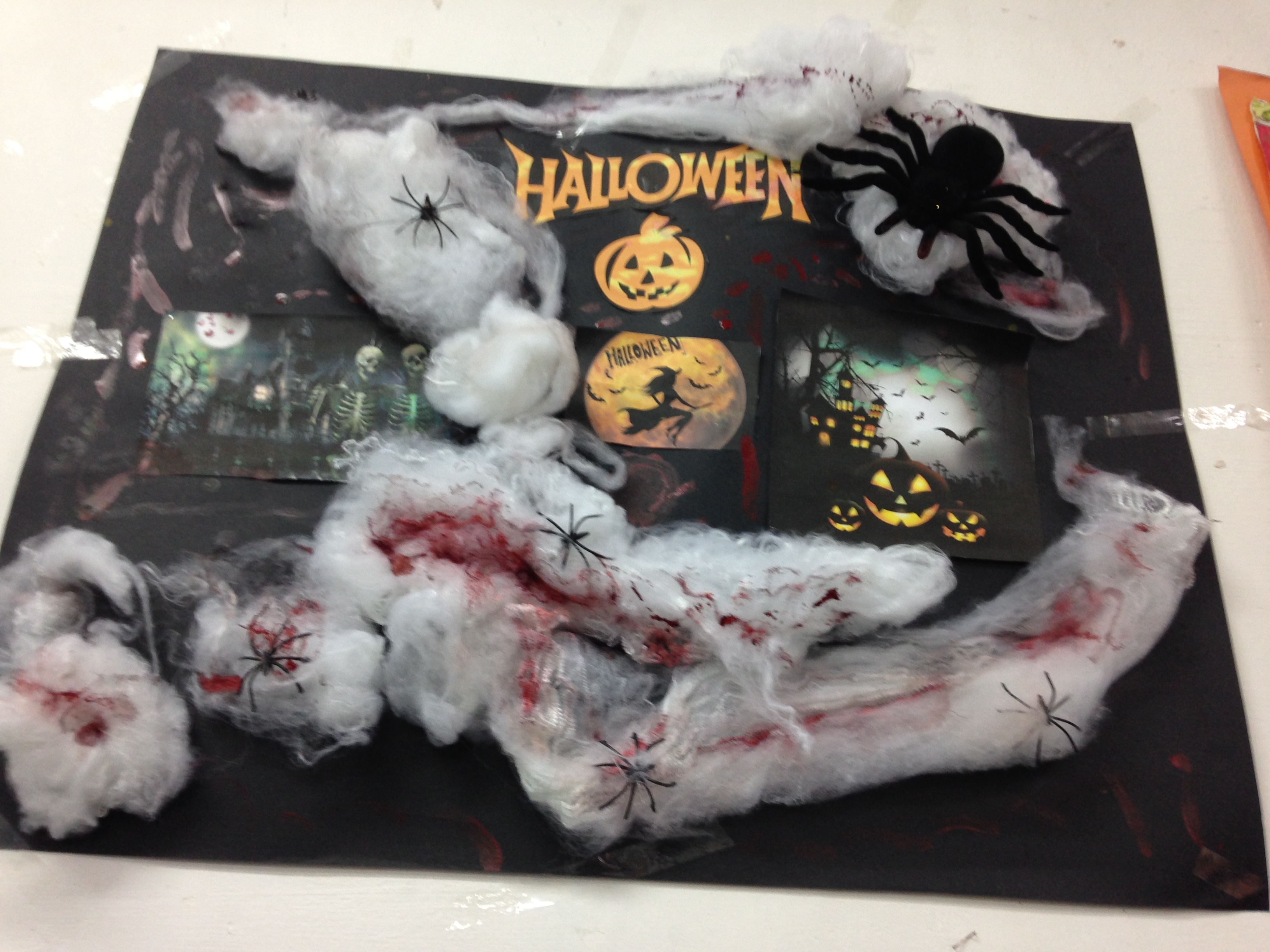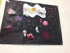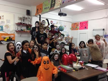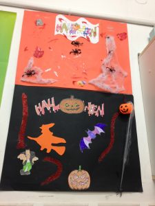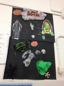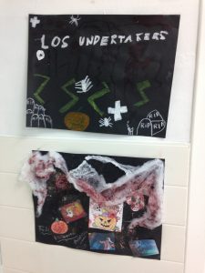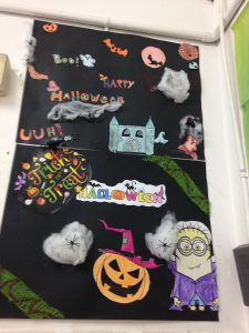 Els nens i nenes de cinquè i sisè han decorat les classes amb murals amb la típica iconografia de Halloween fent ús de carbasses, cotó, aranyes, esquelets i bruixes.