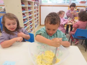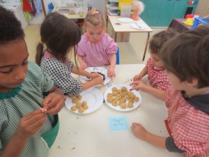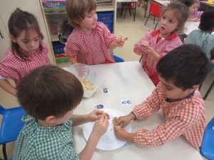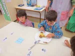 En el taller de cuina han preparat un pallasso tallant la fruita i unint-la amb palets. Un cop fet, se l’han menjat i dibuixat.