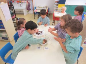 En el taller d’experiments han identificat diferents materials rodons i comprovat com reaccionaven segons la composició del què posaven a l’aigua. Després ho han verbalitzat.