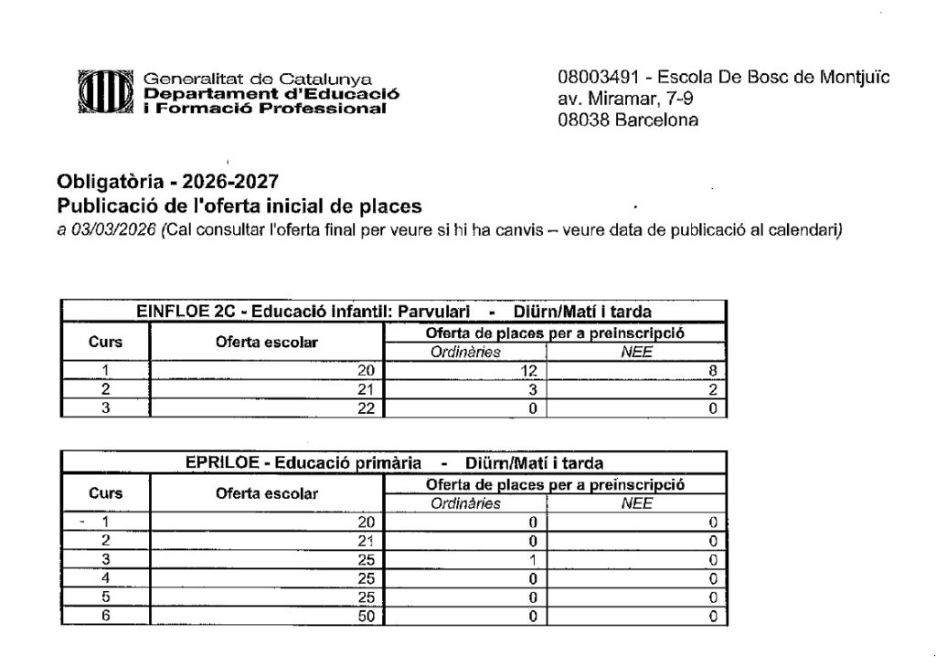 Publicació de l’oferta inicial de places
