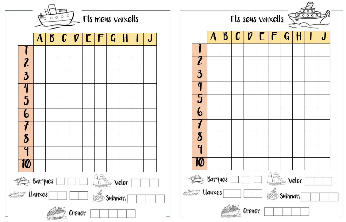 Els que no pugueu imprimir els taulers, dibuixeu, per cada jugador, dues quadrícules de 10X10. Les columnes les heu d’enumerar de la A fins a la J i les files de l’1 al 10. Tal com veieu a la imatge.