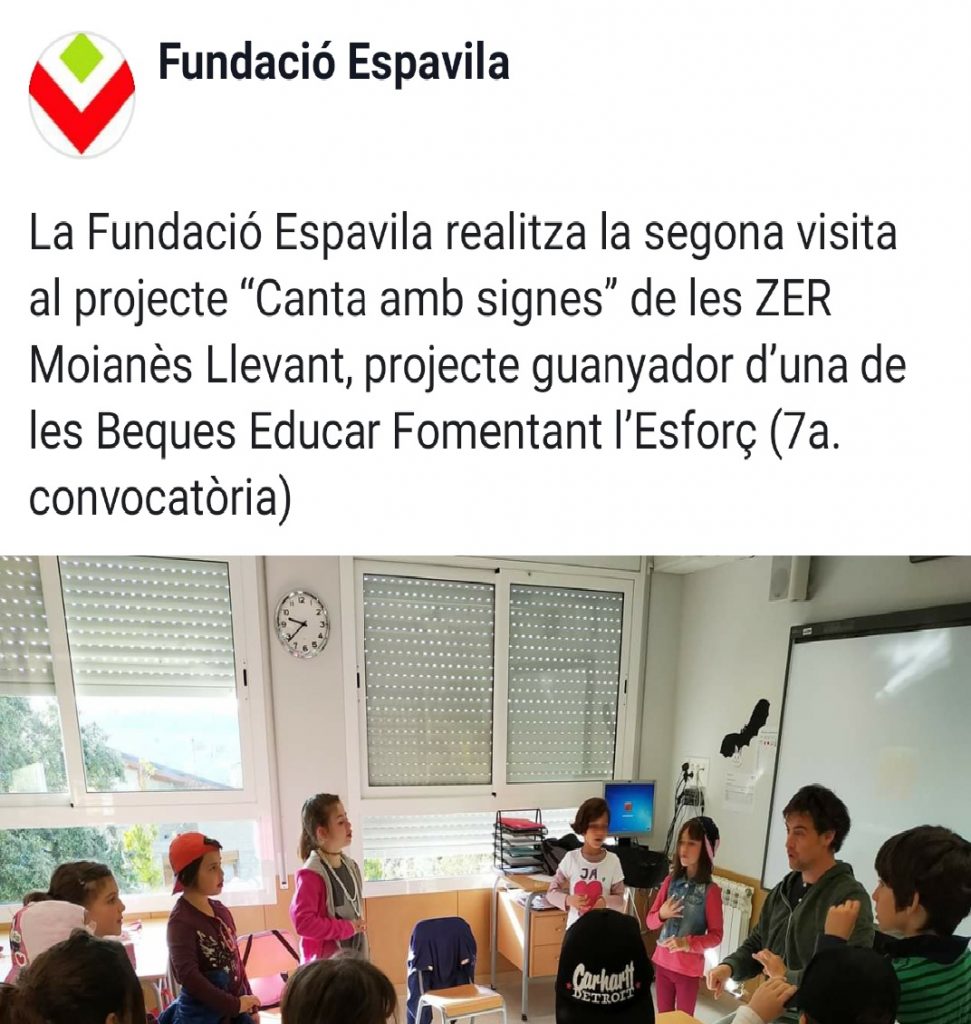 El curs passat la ZER va ser premiada amb una beca de la Fundació Espavila pel projecte “Canta amb Signes”. Una de les Beques Educar Fomentant l’Esforç que anualment concedeix aquesta fundació de Granollers.