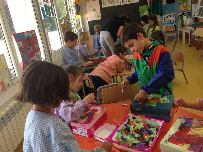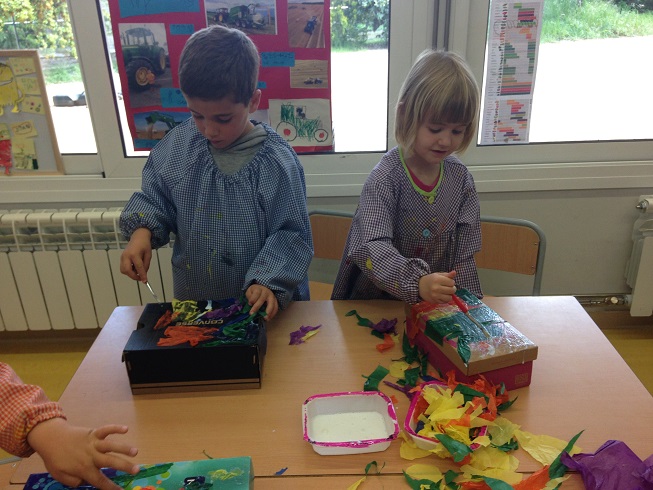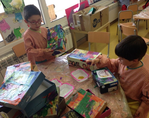 Amb la Núria, la mare de l’Arlet, hem fet un taller de decoració de capses. Cadascú de nosaltres n’ha personalitzat una que servirà per guardar-hi les sabatilles o les sabates quan som a l’escola. Així ho tenim més endreçat! Per fer-les ben maques les hem folrat amb paper de seda de colors, hi hem posat un dibuix de temàtica hindú i l’hem fet ressaltar amb pintura daurada…una bona feinada que ens ha quedat molt bé!