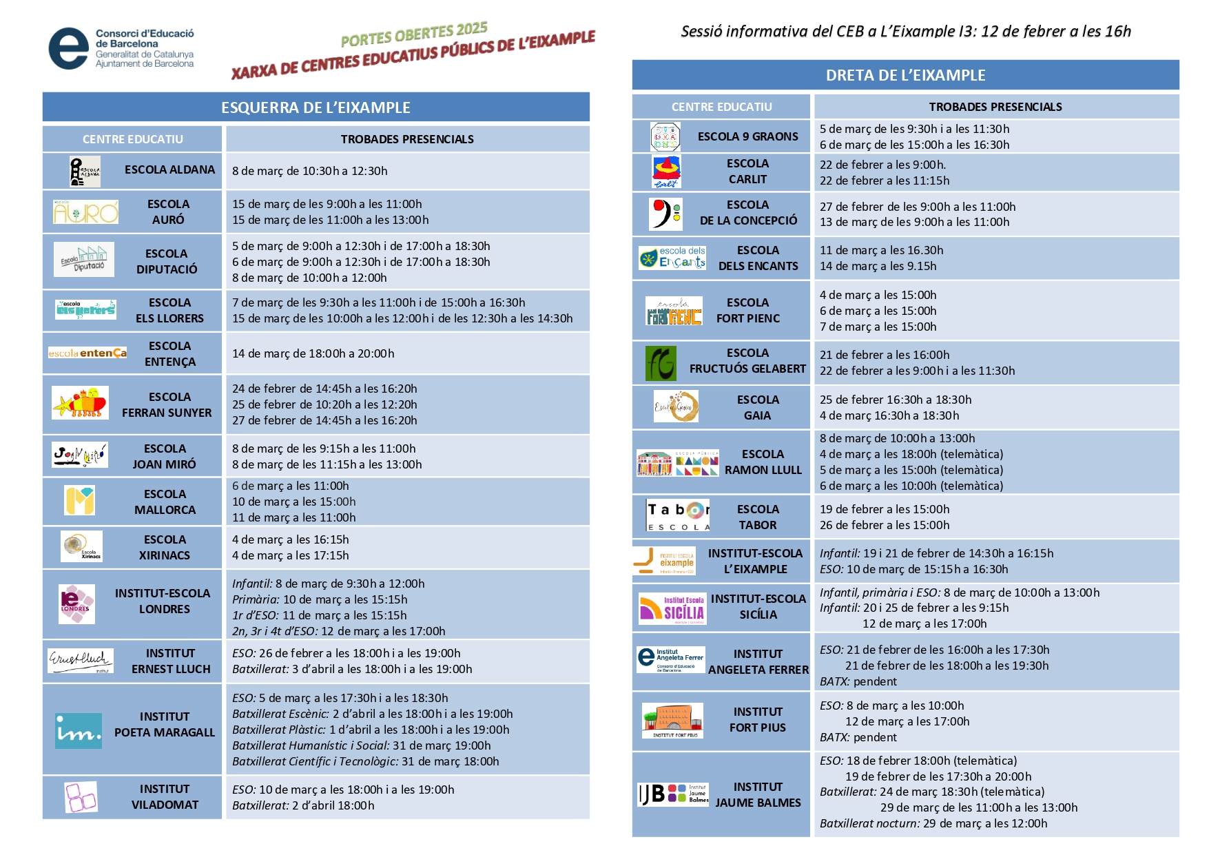 D’altra banda, aquí teniu les pàgines web de les escoles públiques de l’Eixample i el cartell on s’anuncien totes les portes obertes: