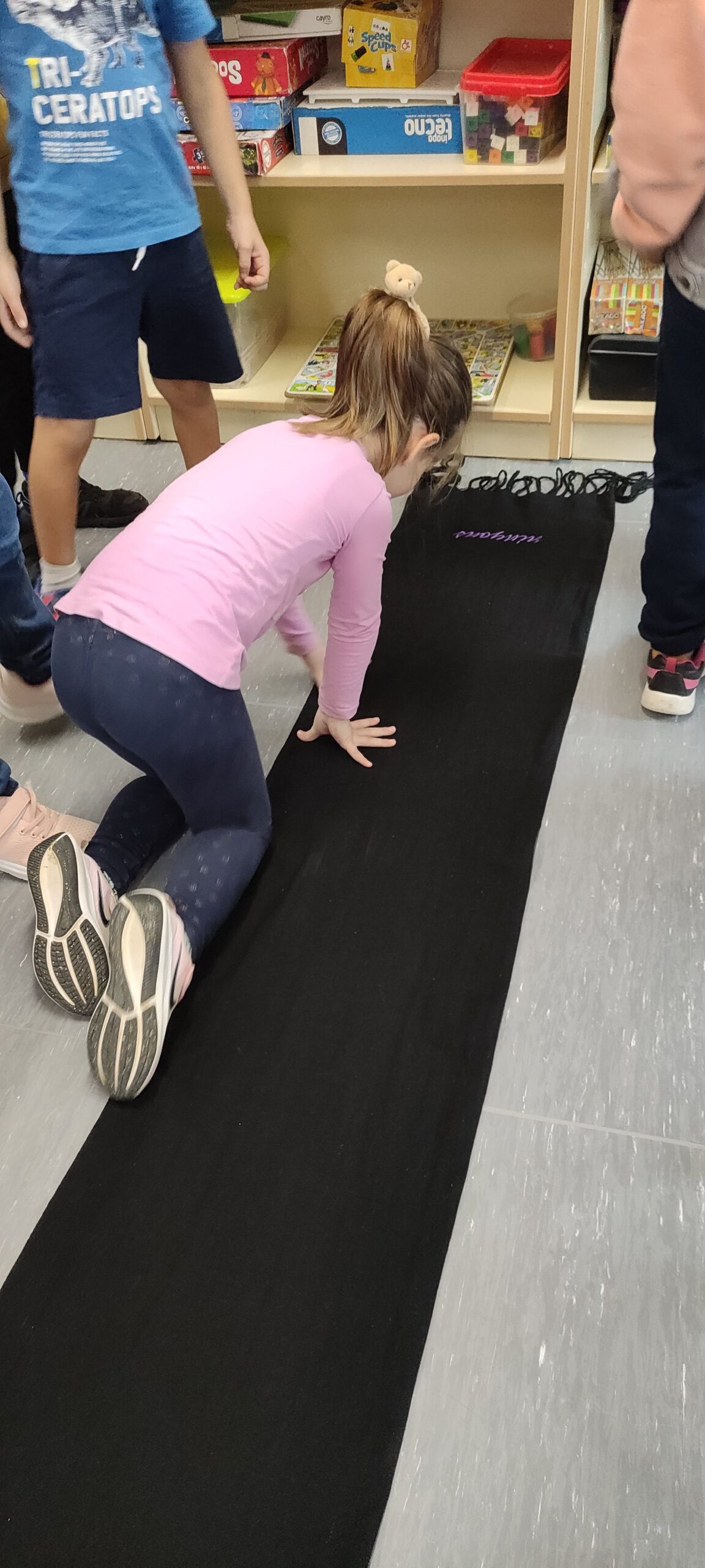 El que més ens ha impactat és la FAIXA, que per nosaltres era super llarga i gegant, i hem volgut mesurar-la de diferents maneres: comptant nens i nenes del grup, estirats a terra, amb mans, amb passes, amb peus... i finalment hem necessitat la CINTA MÈTRICA perquè ens sortien mesures molt diferents, i ens hem adonat que amb aquesta eina no canvia la mesura.
