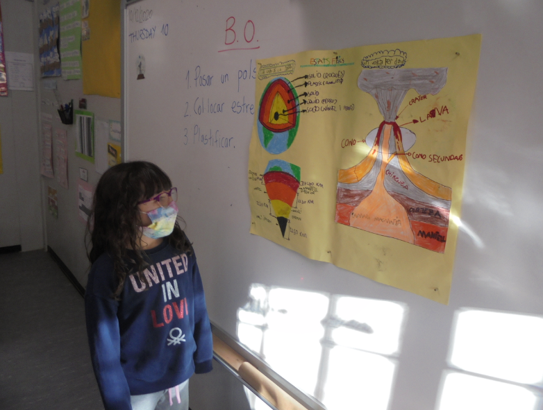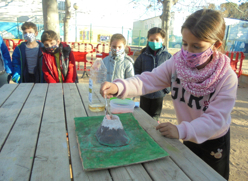 2. La Nora i l’Anna ens han explicat quines són les capes de la Terra i l’Èlia ens ha fet un experiment d’un volcà. Ens encanta fer de mestres!
