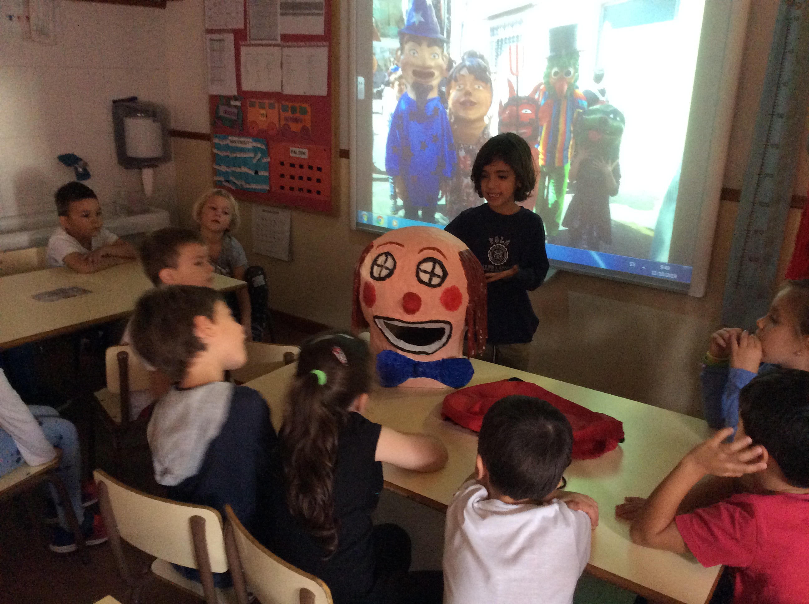 El pare del Joaquim que forma part de la colla gegantera del Guinardó ens ha vingut a explicar que vol dir ser d’una colla gegantera. El Joaquim ha portat un capgròs fet per ell i tots i totes ens l’hem pogut posar.