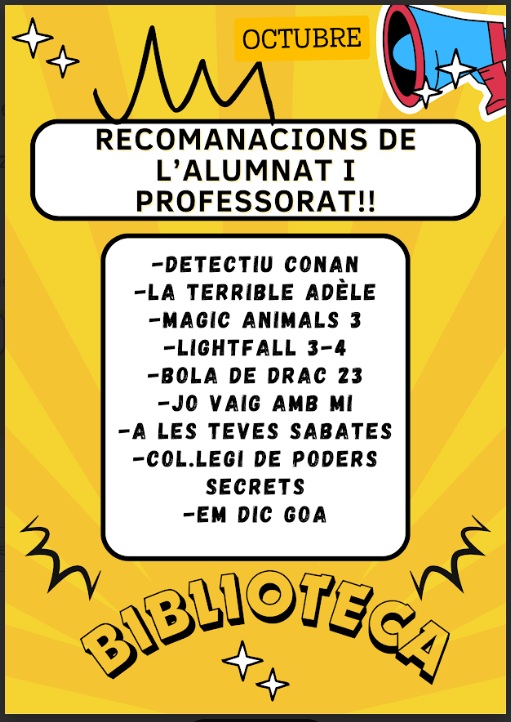 Llibres recomanats Feu un comentari / Per admin / 29 d'octubre de 2025 / Alumnes Biblioteca Cicle Inicial Cicle Mitjà Cicle Superior Curs 2025-2026 General Portada Primària / 2025-2026, biblioteca, llibres recomanats, octubre A partir d’aquest d’ara compartirem la llista de llibres recomanats del mes que han estat triats entre l’alumnat i el professorat de l’escola. Aquí teniu la primera selecció: