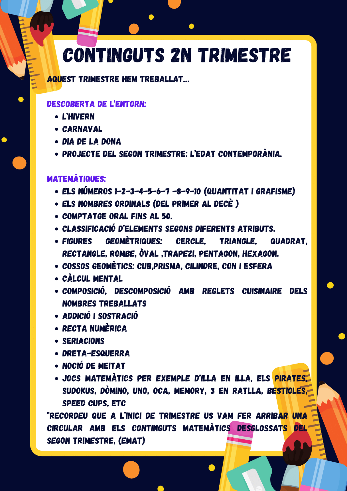 Ja hem arribat a la fi del segon trimestre, per aquesta raó, el científics i els Dofins volem compartir amb tots vosaltres els continguts que hem anat treballant al llarg d’aquests mesos i un petit recull fotogràfic d’algunes activitats que vam realitzar que podreu visualitzar fent click a l’enllaç del final.